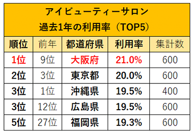 アイビューティーサロンの利用は、「大阪府」が前年9位から大幅ランクアップ!