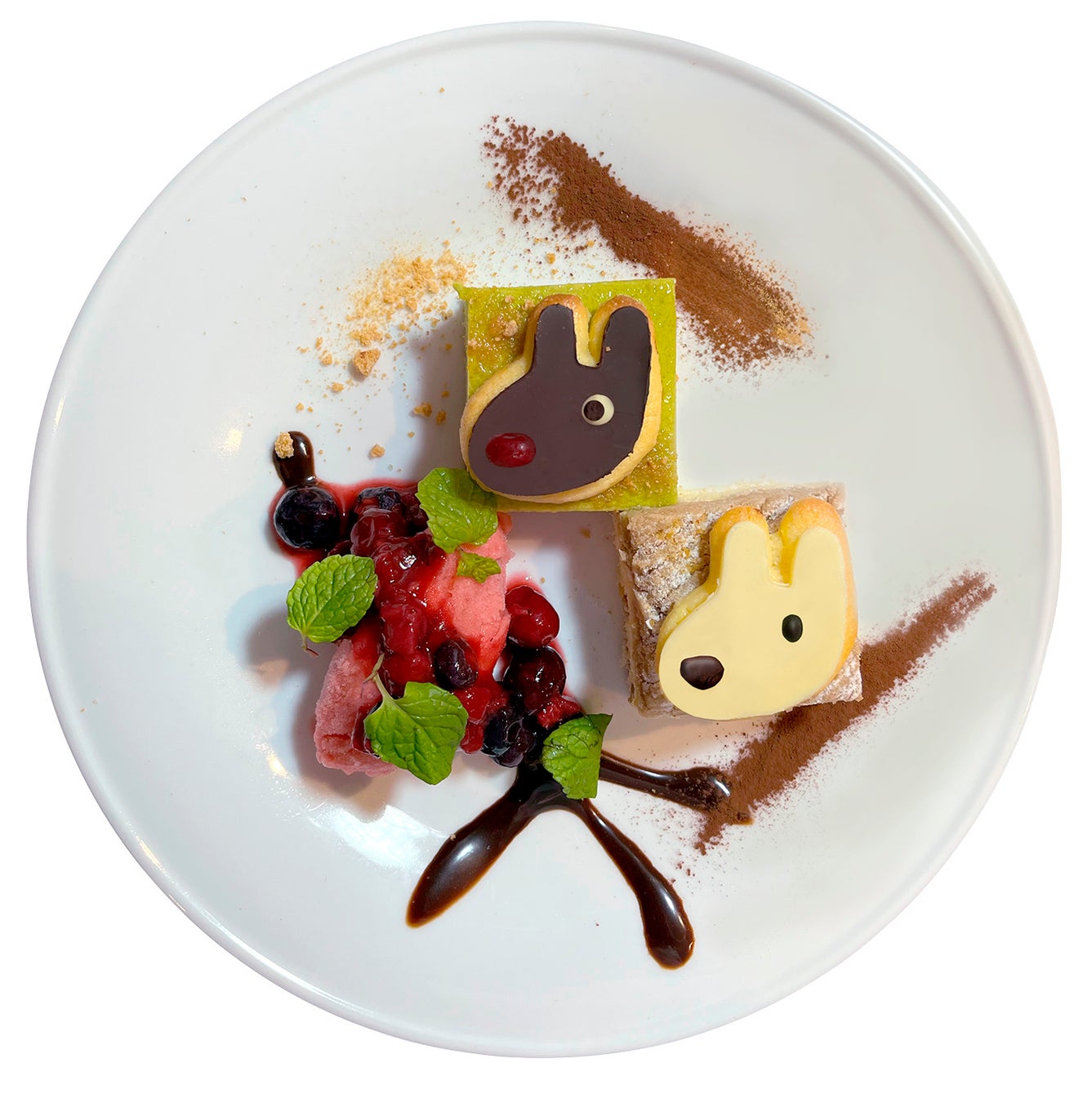 リサとガスパールのプティケーキにベリーソースを添えました。