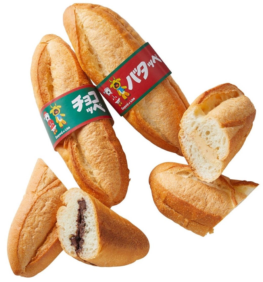 昭和21年創業、神戸のベーカリー「ケルン」とコラボレーション。ソフトフランスにミルクチョコをサンドしたチョコッペ、ピーナツバタークリームをサンドしたバタッペ。ラベルにリサとガスパールが。