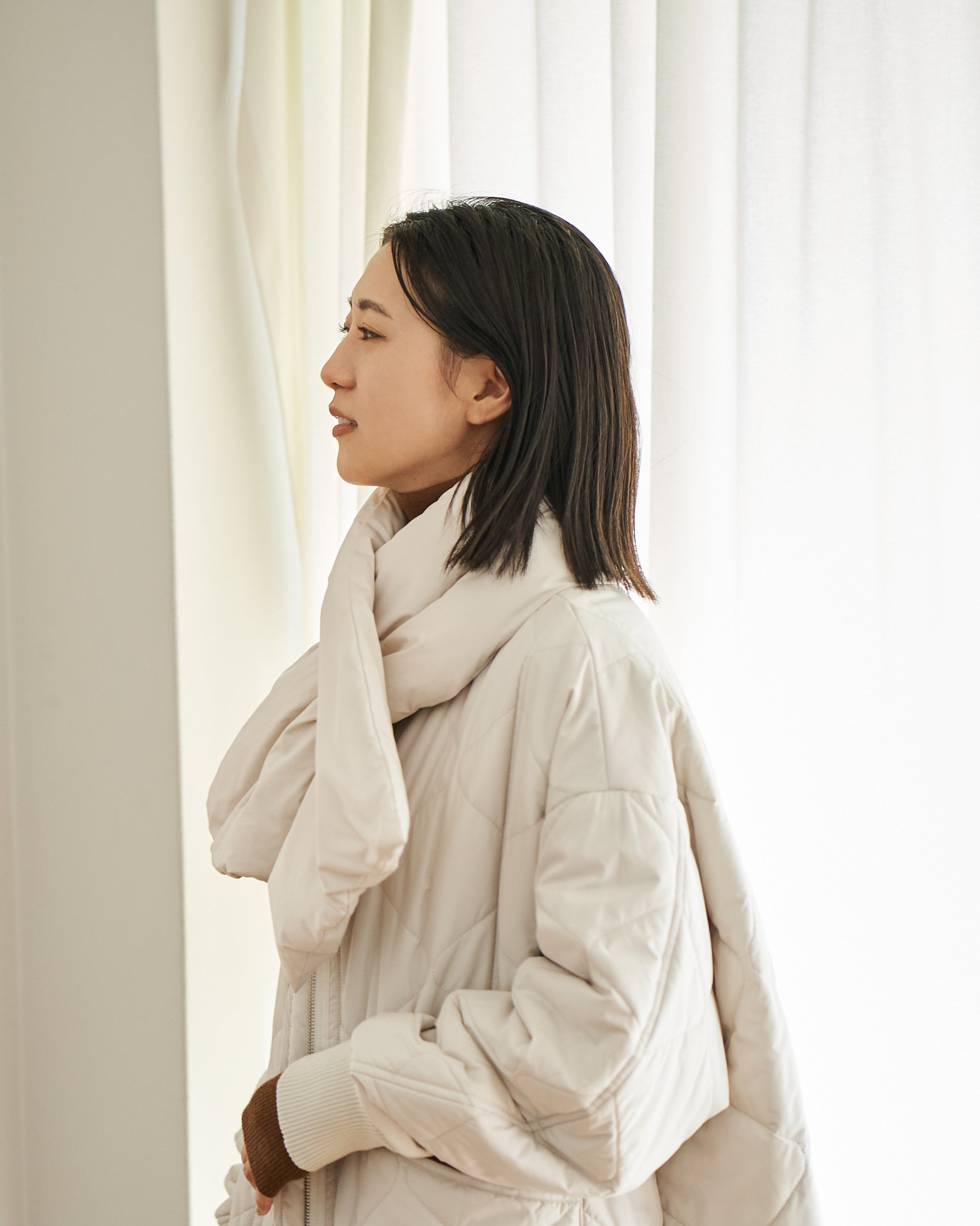軽い着け心地ですが、見た目以上の暖かさが魅力。キルティングコートとのセット着用もおすすめですが、ベーシックなデザインなのでお手持ちのアウターとも合わせやすいストールです。