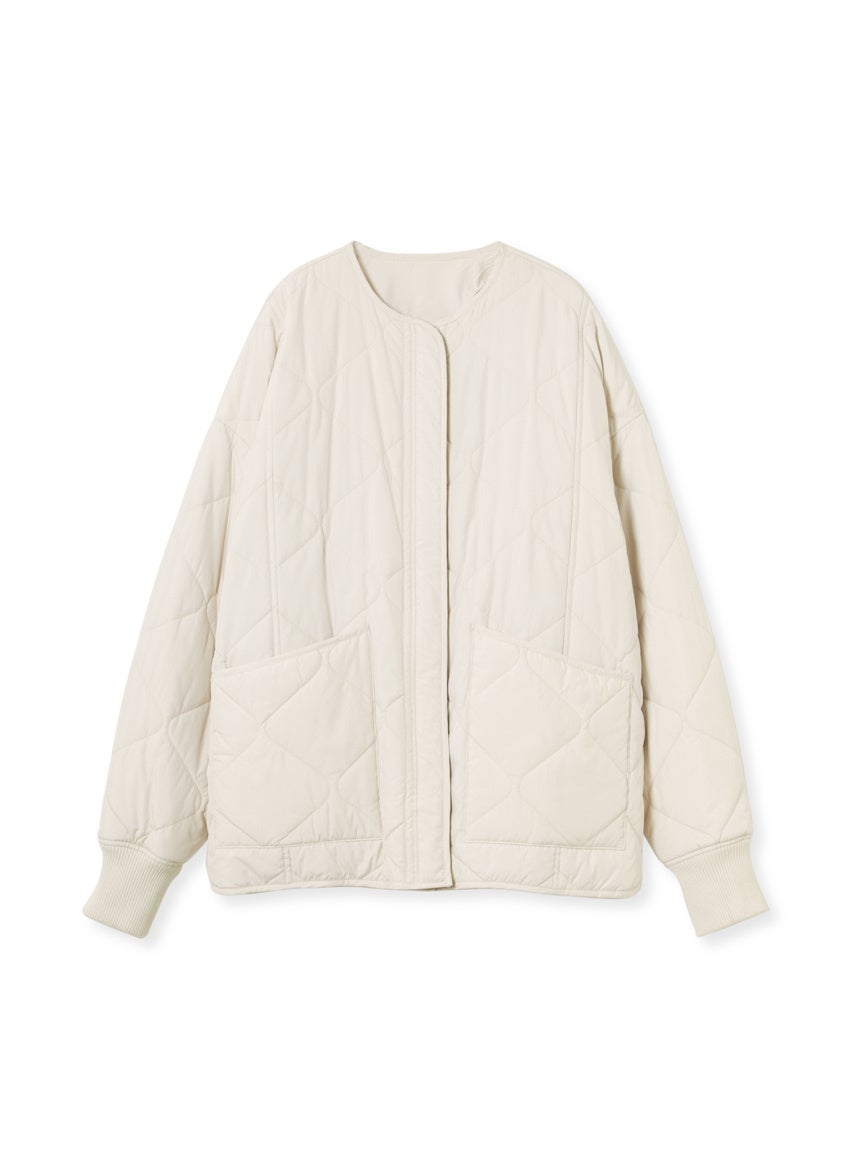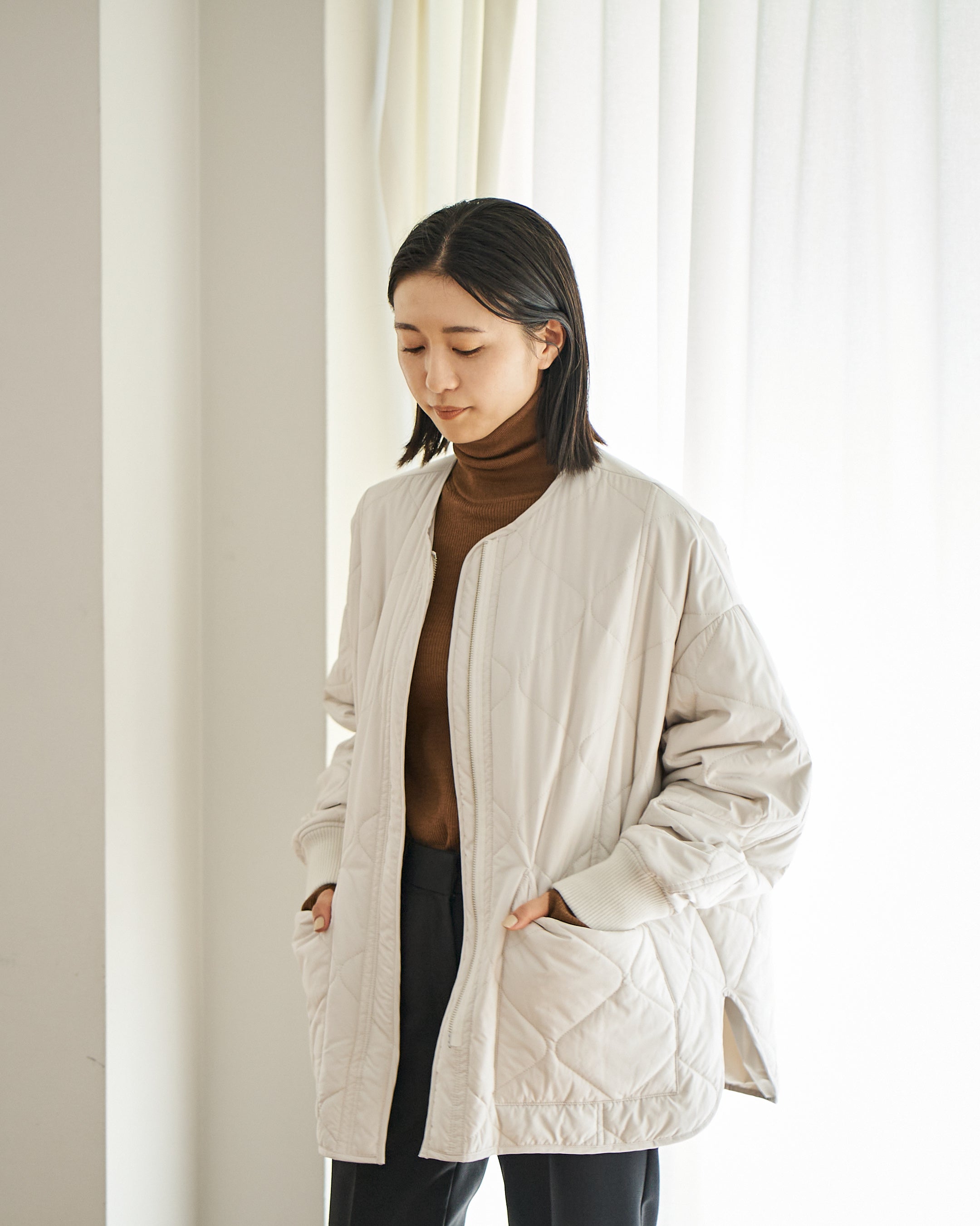 表地にリサイクルポリエステルを使用し、表情豊かなキルティングとスタンダードな無地をリバーシブルで楽しめるミドル丈アウター。身体をすっぽりと包み込むAラインのシルエットで、ヒップが隠れる丈感は使い勝手良く、スリムパンツやロングブーツとも相性抜群。