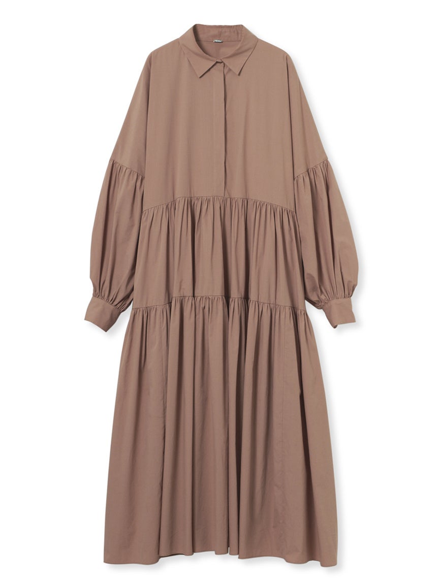 袖パフの切り替えを低めに設定し、襟とカフス部分に知的でベーシックなシャツディティールを取り入れることで程よく甘さを引き算。長すぎない丈で様々なシューズともコーディネートしやすいバランスで着こなせます。