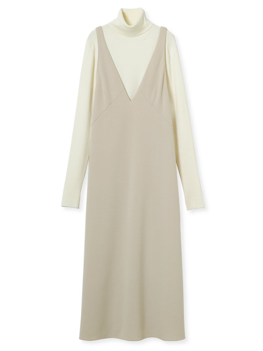 Vネックキャミソールワンピースと、ベーシックなタートルニットのセットアイテム。