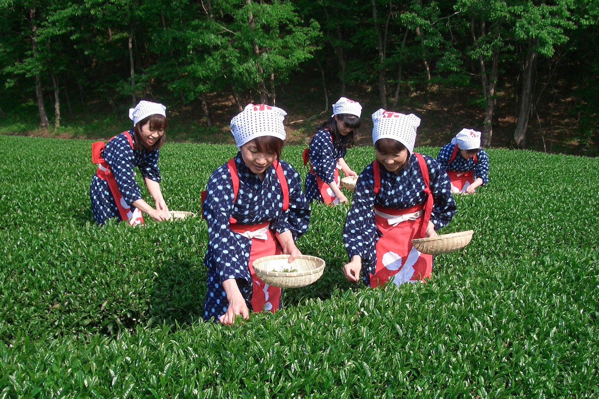 蔵屋鳴沢では、お茶摘みの衣装に着替えて、二つの世界遺産「韮山反射炉」と「富士山」の絶景を眺めながら、お茶摘みをお楽しみいただけます。お茶摘みの際に、頭に巻くオリジナルの手ぬぐいと蔵屋鳴沢製造のお煎茶、摘んだ生葉はお土産に。春のさわやかな風に包まれながら、新緑の茶畑でお茶の手摘みを体験し、心も身体もリフレッシュ。