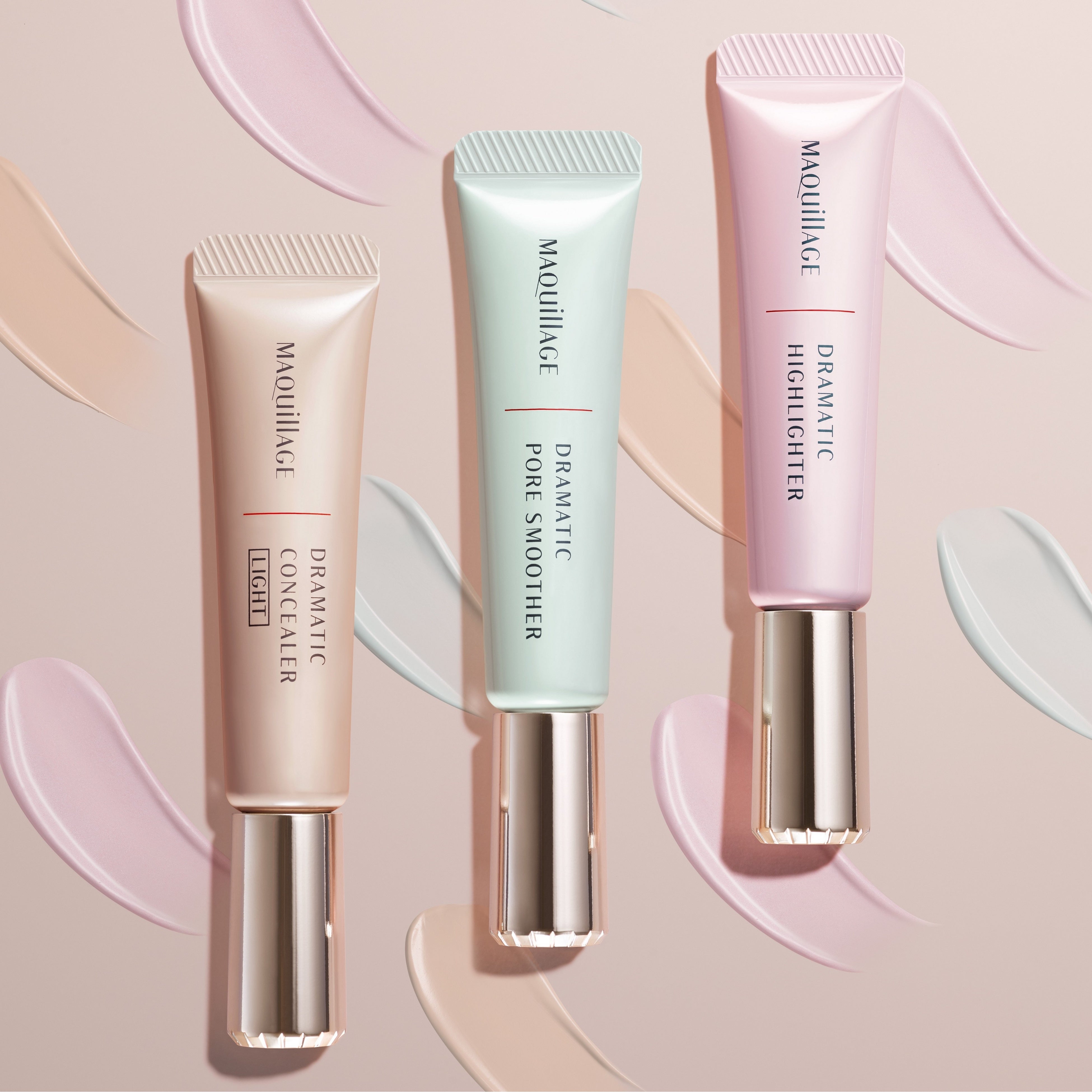 ◆いつものメイクにプラスするだけで惹きつけられるような肌になる部分用ベースメイクアイテムとして、毛穴つるん美容液下地「ドラマティックポアスムーザー」、濡れつや美容液ハイライト「ドラマティックハイライター」、密着美容液コンシーラー「ドラマティックコンシーラー」を発売します。