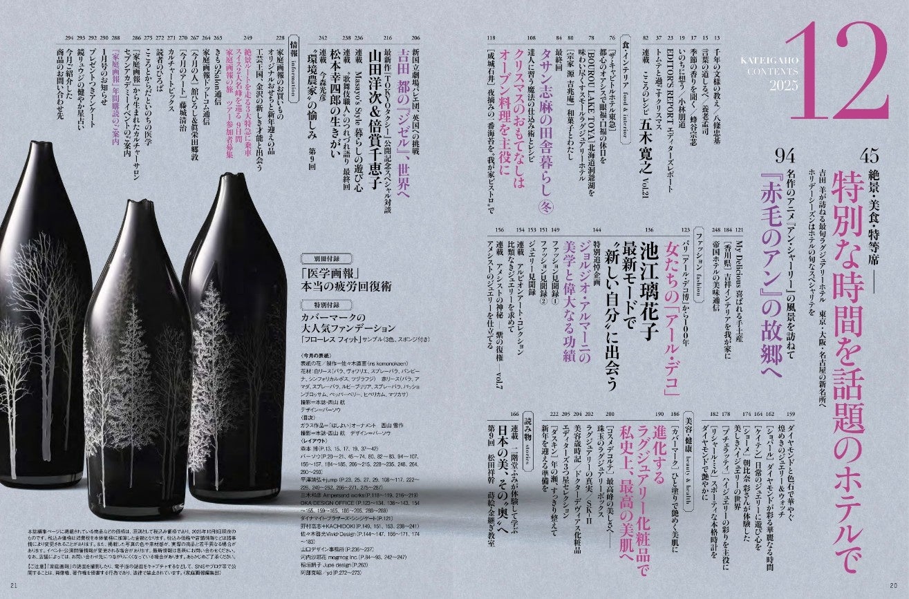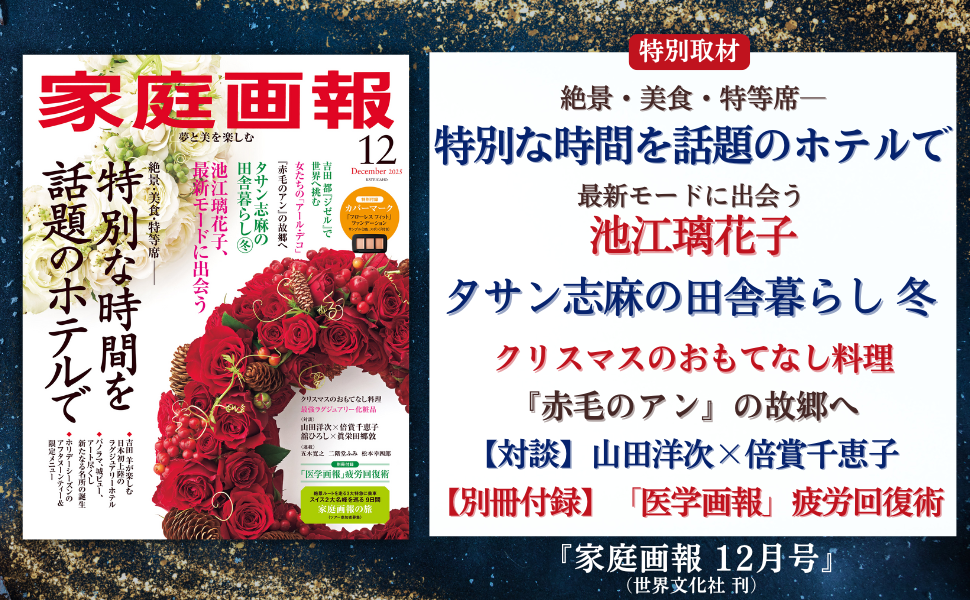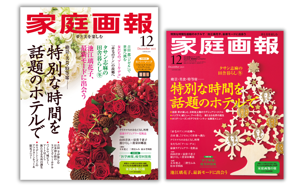 株式会社世界文化社は、『家庭画報 12月号』を10月31日(金)に発売します。巻頭特集「特別な時間を話題のホテルで」では、1年の締めくくりにふさわしいラグジュアリーホテルでのひとときをご案内します。「池江璃花子、最新モードに出会う」ではロングインタビューとともに最新モードに挑戦する池江さんの姿をお届け。さらに、最終回となる連載「タサン志麻の田舎暮らし 冬」、人気シェフに教わる「クリスマスのおもてなし料理」、『赤毛のアン』の故郷・カナダのプリンス・エドワード島への旅、山田洋次監督と倍賞千恵子さんの特別対談、「医学画報」疲労回復術など、ホリデーシーズンを彩る華やかな企画が満載です。