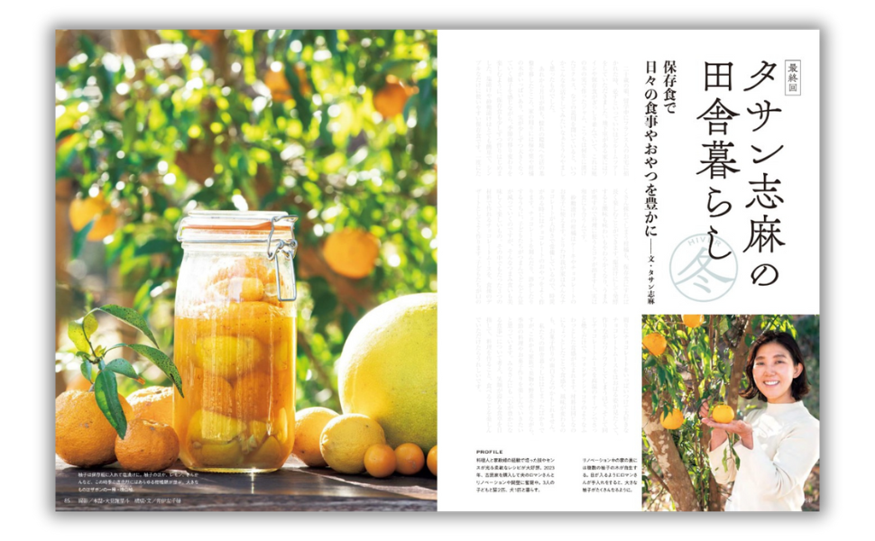 古民家のある静かな里山を舞台にした大好評のタサン志麻さんの季節連載が、最終回を迎えます。今号は志麻さん流、冬の柑橘で作る保存食の味わい方を教えていただきました。塩柚子、塩レモン、きんかんの砂糖漬けの作り方、それらを活かした日々の食事やおやつのレシピをご紹介。冬のごちそうと志麻さん一家の心豊かな暮らしをお届けします。