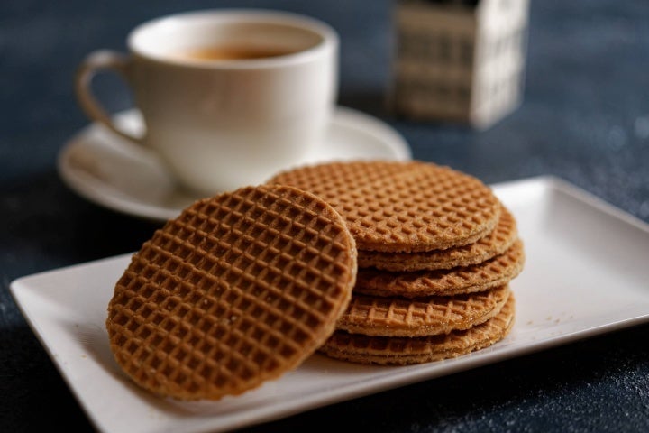 オランダの定番おやつ、ストロープワッフル。薄く焼いたワーフル生地に特製キャラメルをたっぷりはさんだユニークな食感のお菓子。