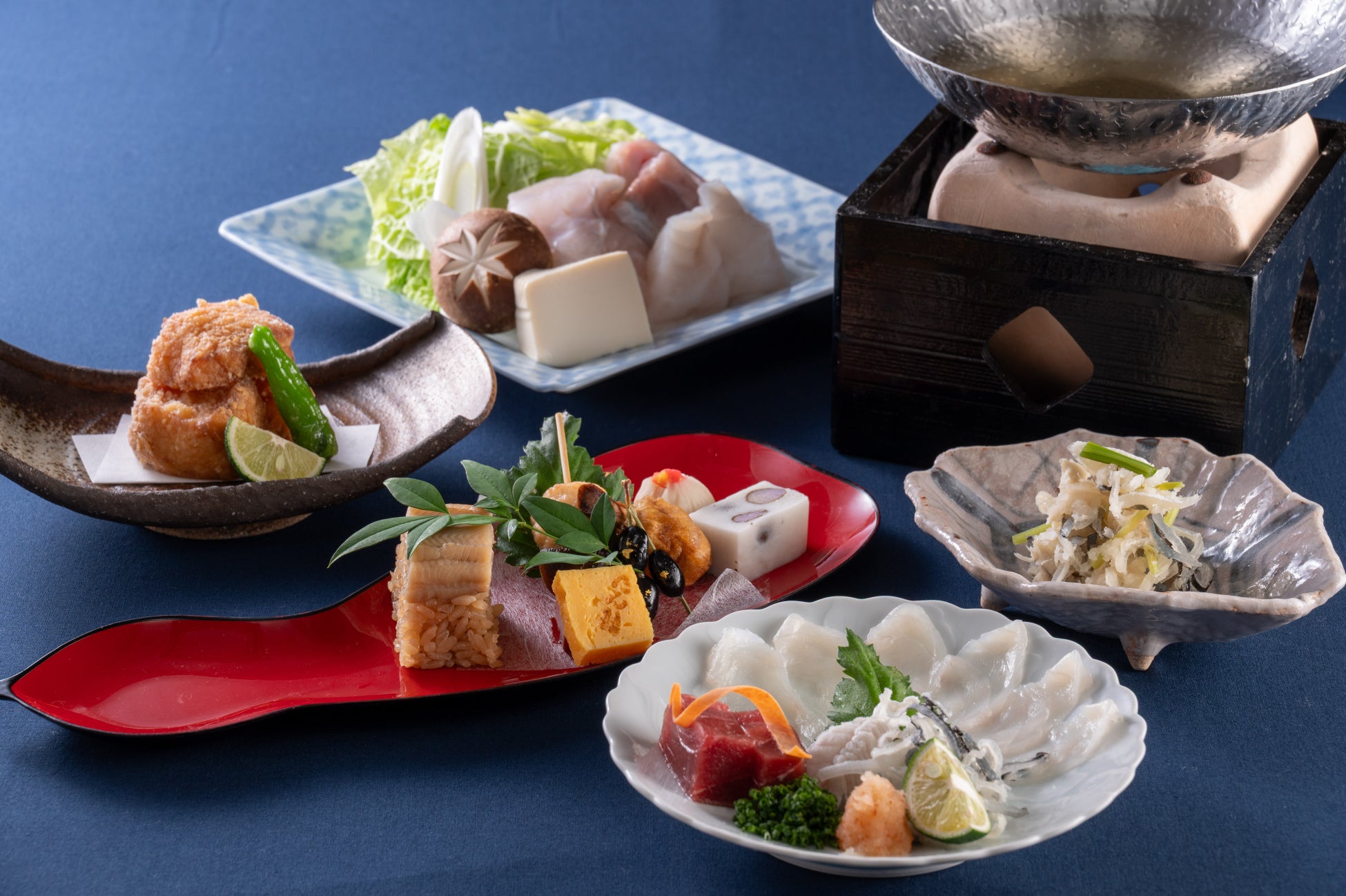 ランチタイムに気軽にふぐを愉しめる全7品の「ふぐ御膳」、またランチ・ディナータイムどちらでもお召しあがりいただける、ふぐづくし全8品の「とらふぐ会席」をご用意いたします。