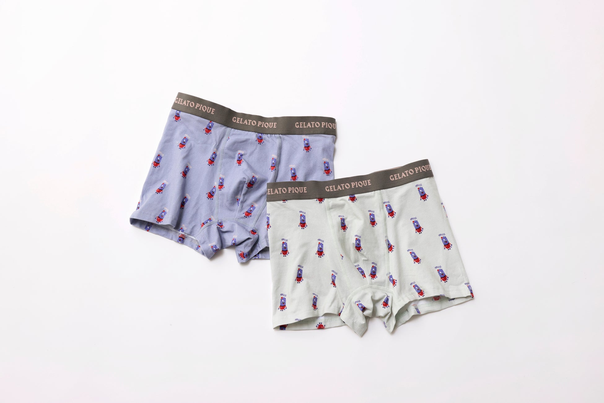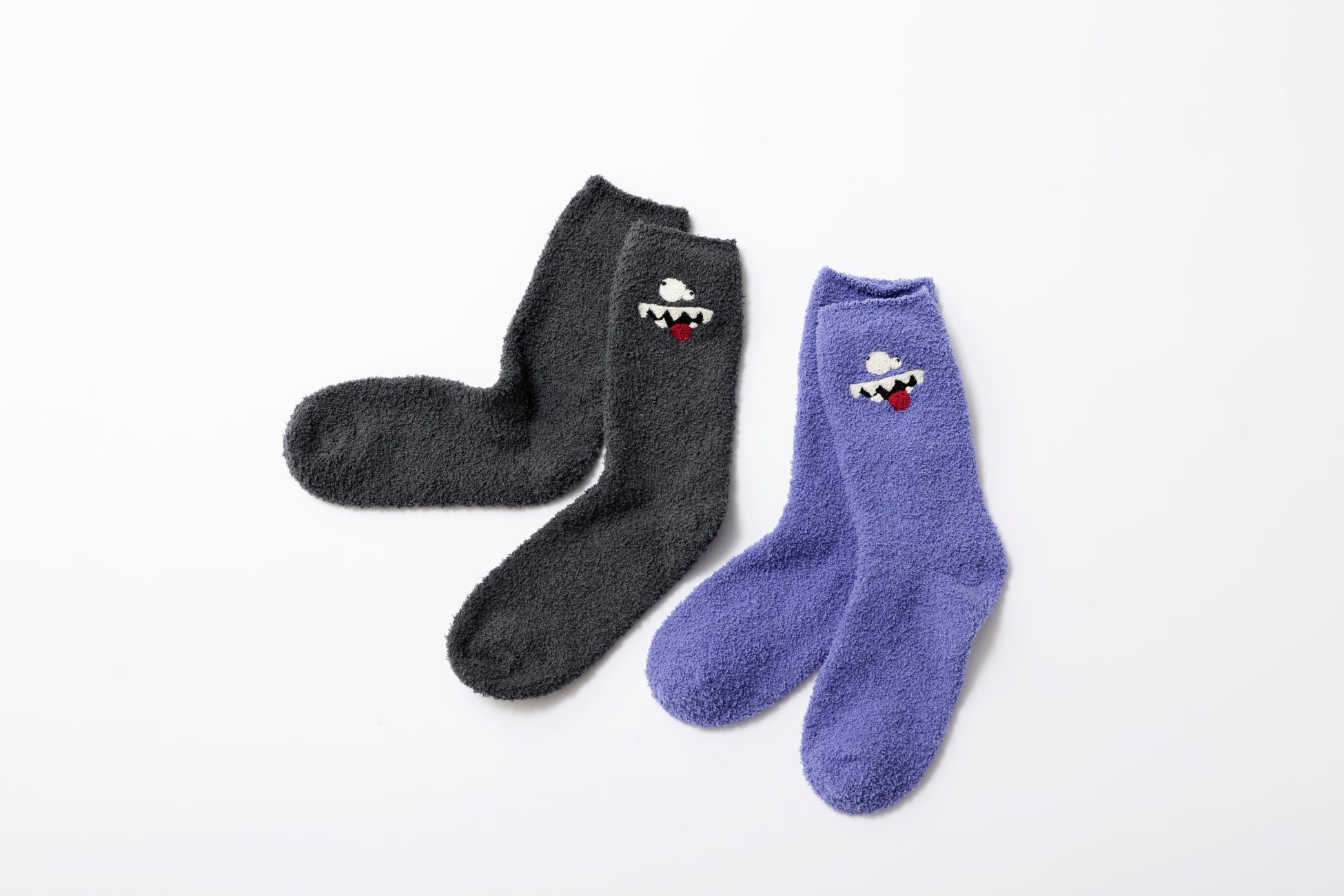 ふっくらとしたボリュームで足を柔らかく包む‘ベビモコ’素材を使用したルームソックスは、モンスターをワンポイントで表現。ボクサーパンツは総柄の2色1セットをBOX入りで販売します。