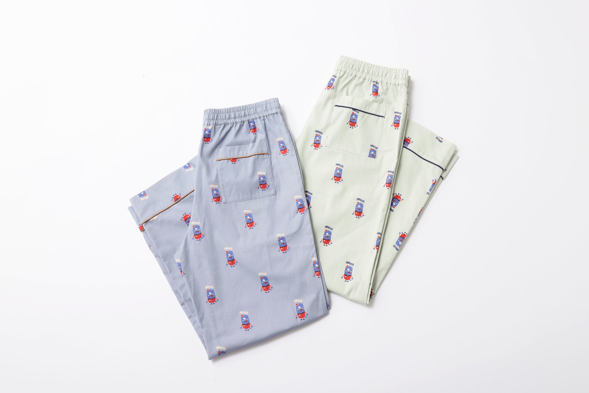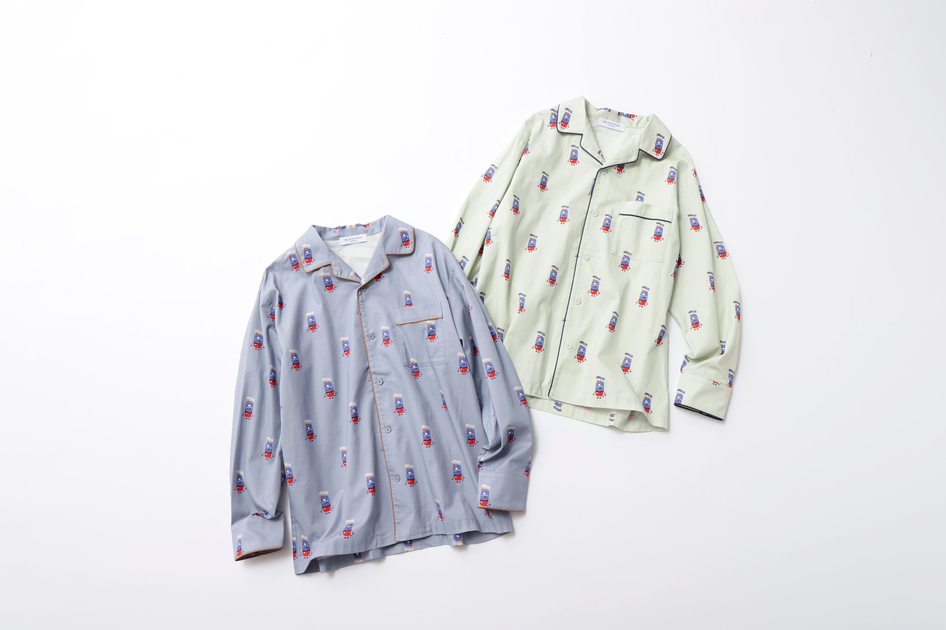 かわいらしいモンスターを総柄で表現したパジャマシャツは、パイピングのデザインがアクセント。