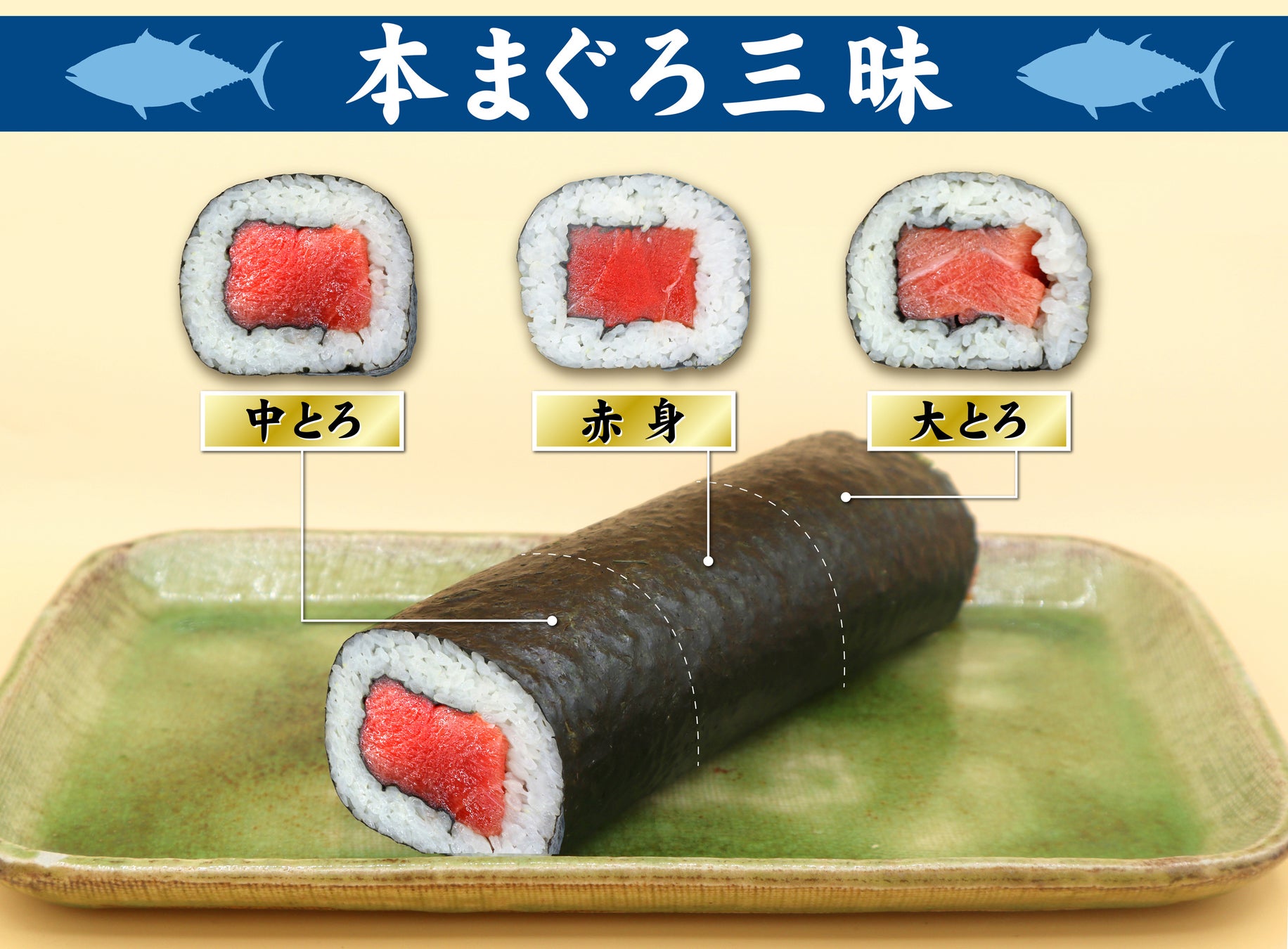 本まぐろ三昧!生本まぐろの大トロ、中トロ、赤身を贅沢にたっぷりと入れて巻いた逸品です。
