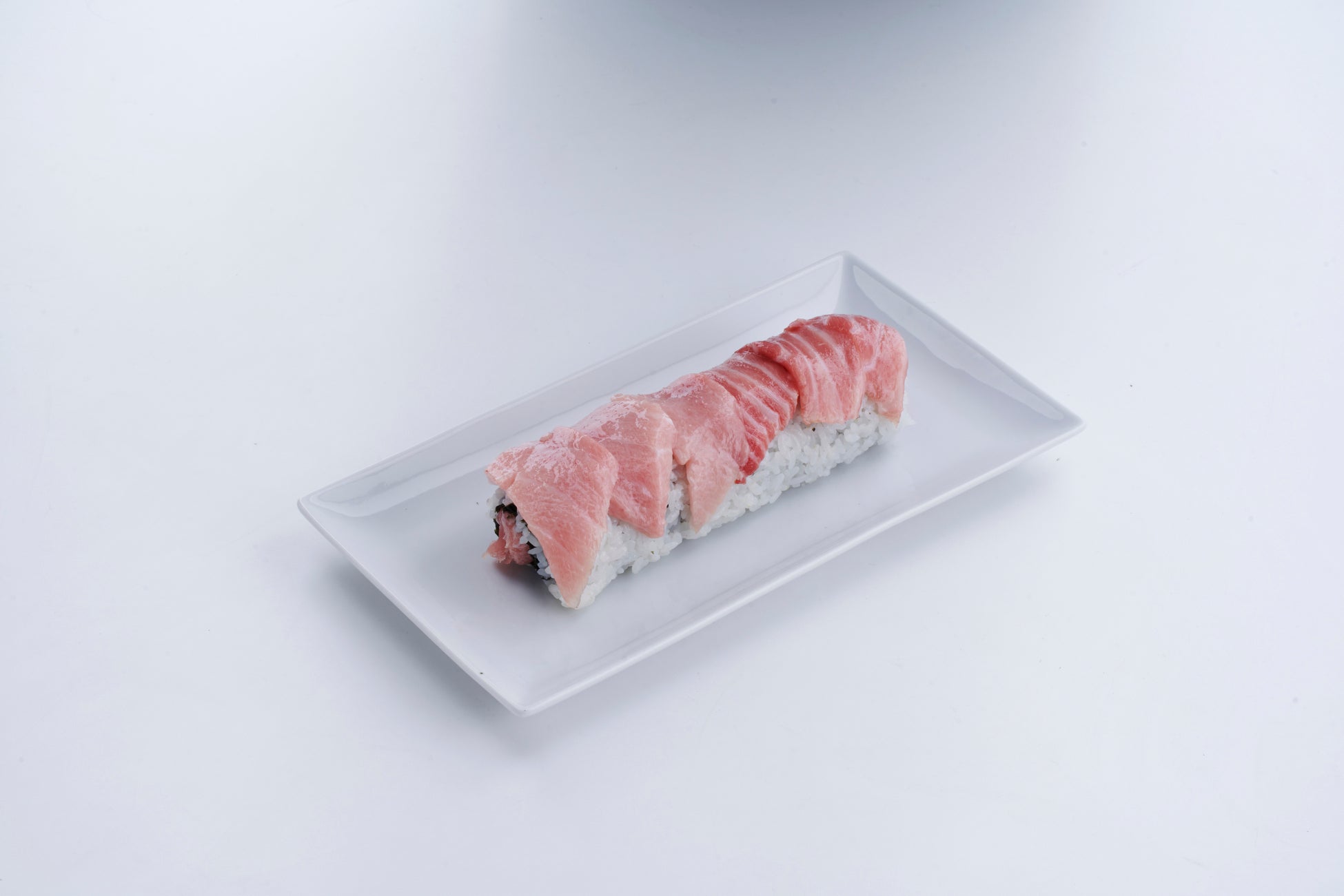 本マグロとインドマグロのトロを半々に乗せた太巻。
