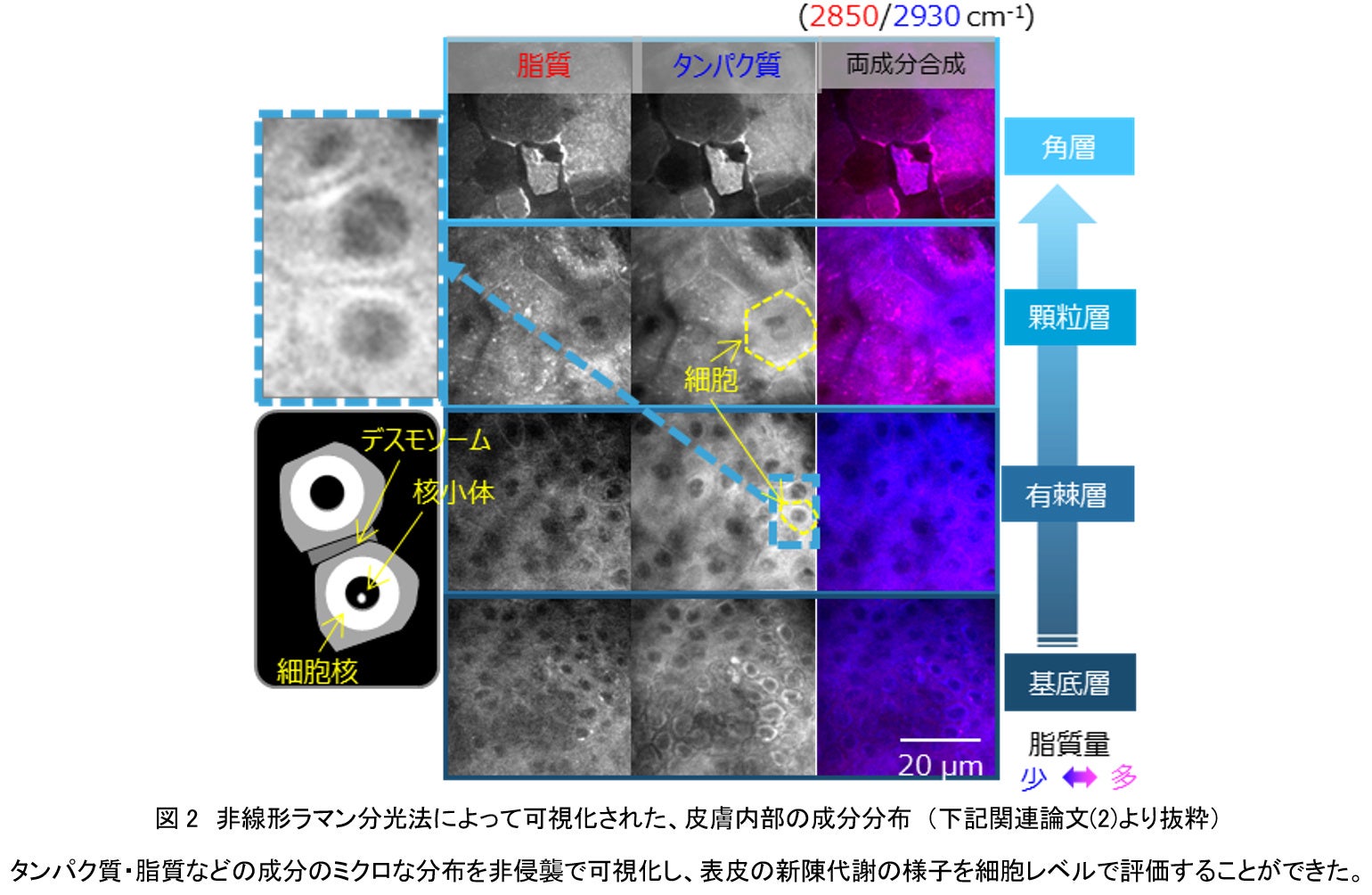自発ラマン分光法の1000倍程度の高速イメージングが可能な技術で、皮膚における水・タンパク質・脂質の3次元分布の可視化を可能にしました。(図2)
