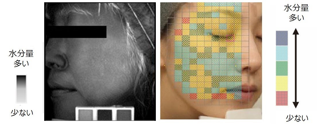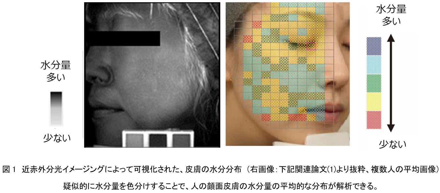 水の検出感度が高い近赤外分光法に基づく技術で、顔面の水分分布などの可視化を可能にしました。(図1)