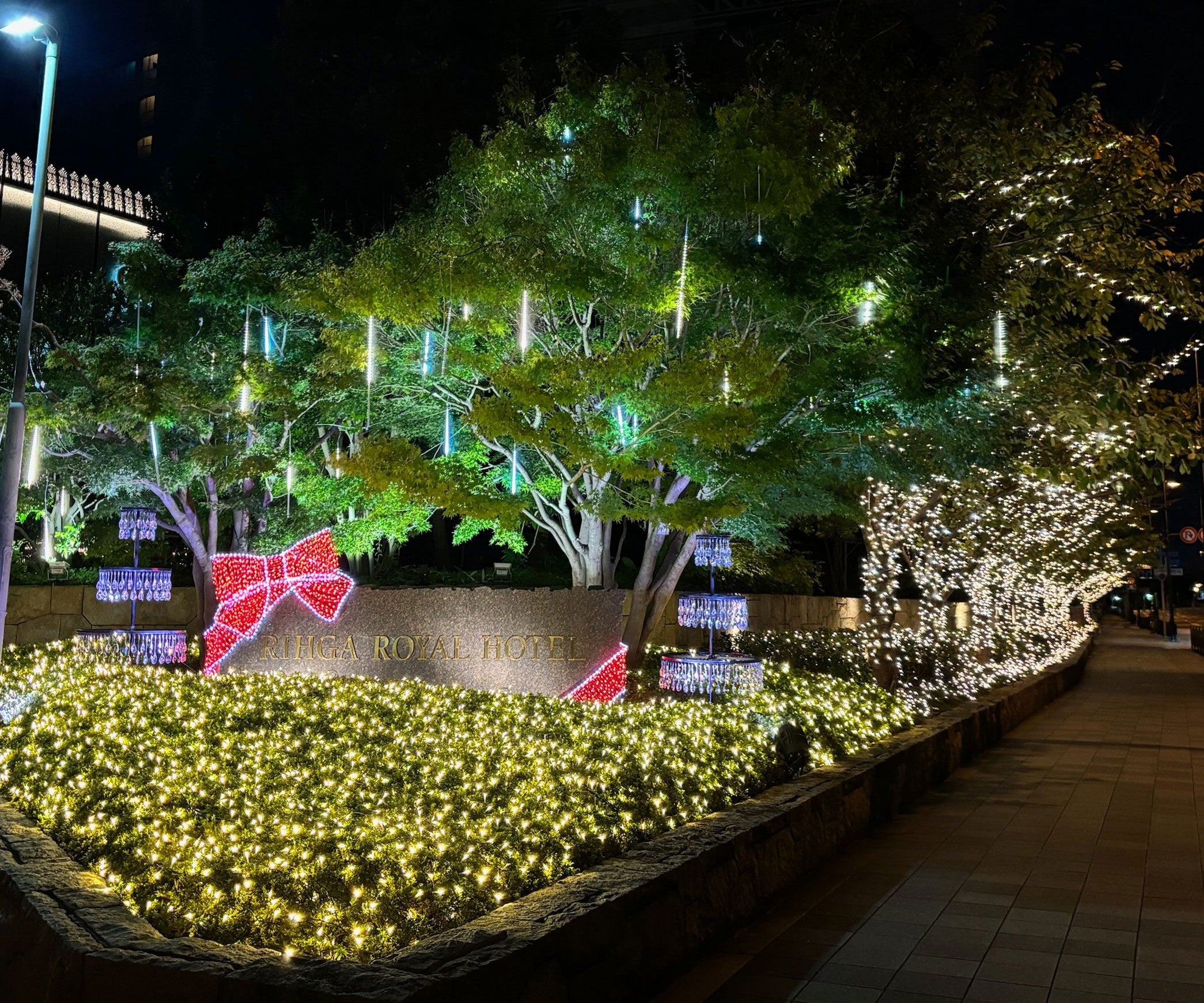 ホテル前庭を約5万球のLEDライトで華やかにライトアップ。中央の石板には、赤いリボン型のLEDを飾りまるでプレゼントボックスのような遊び心あふれる装いに。道路沿いの並木にも優しく包み込むようにゴールドの光が灯ります。また、創業90周年を記念して、アネックス棟前の樹木を赤とゴールドのオーナメントやイルミネーションでクリスマスツリーのように華やかに飾ります。