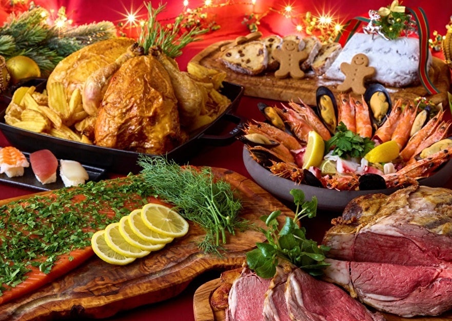 クリスマスの夜にぴったりの、世代を問わずご家族揃って楽しめる50種類以上のメニューが登場。本ズワイガニなど冬の味覚を使用した逸品をはじめ、スタンドクッキングでは、国産牛のローストビーフやローストチキンをシェフが目の前でカッティング。食欲をそそるジューシーな味わいを五感でお楽しみいただけます。また、ドイツの伝統菓子「シュトーレン」をはじめ、クリスマス仕様のスイーツも種類豊富。日本庭園に囲まれた開放的な空間で、心あたたまる特別なひとときをお過ごしいただけます。