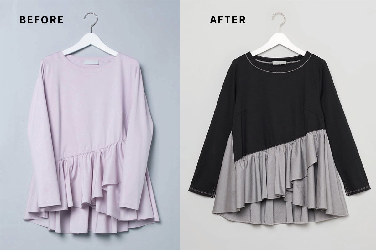 100年以上の歴史を誇る株式会社京都紋付との協業により、[深黒染め]を施したアップサイクル商品を実現しました。今回は、主にシミや汚れが目立つ服を黒染め品としてアップサイクルしました。お気に入りの一着をずっと大切にするために。「黒染」によるリウェアという選択肢を届けます。