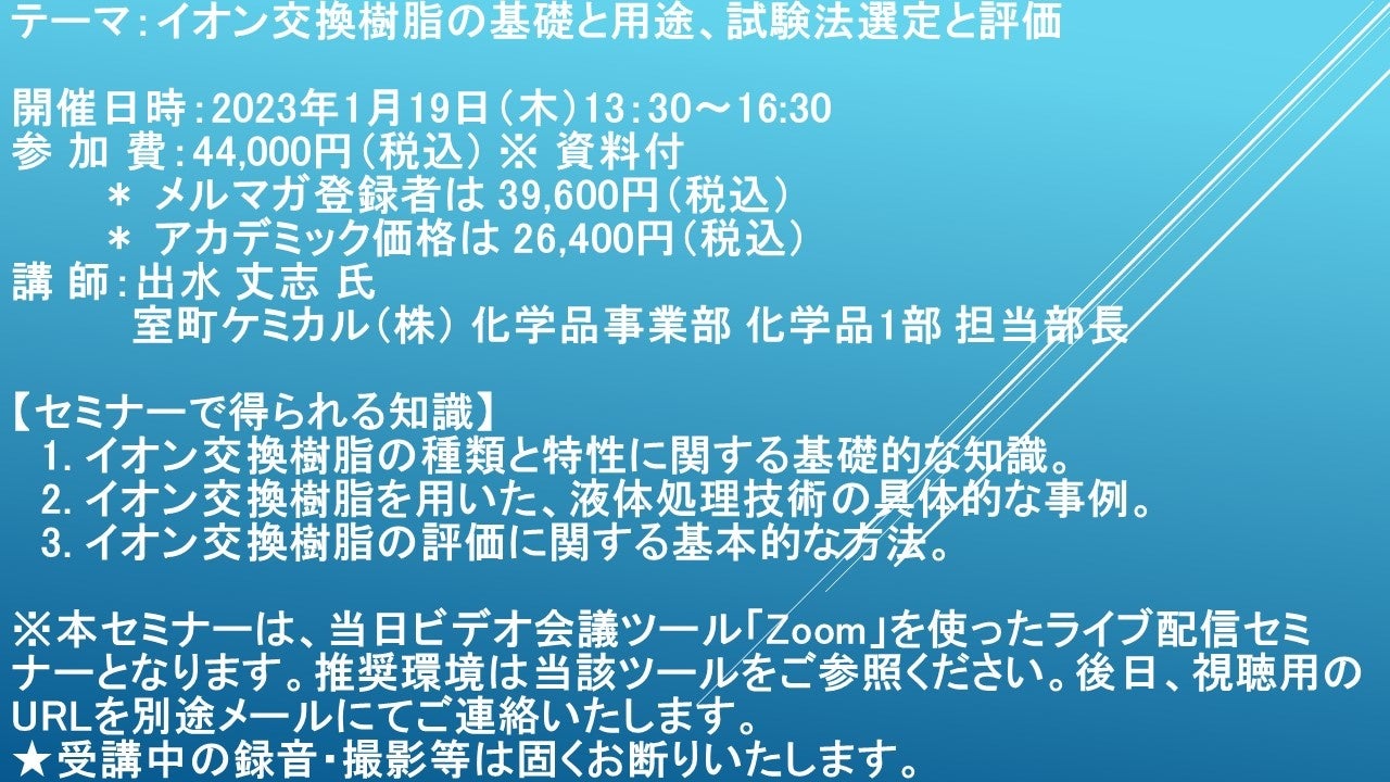 【ライブ配信セミナー】イオン交換樹脂の基礎と用途、試験法選定と評価 1月19日(木)開催 主催:(株)シーエムシー・リサーチ
