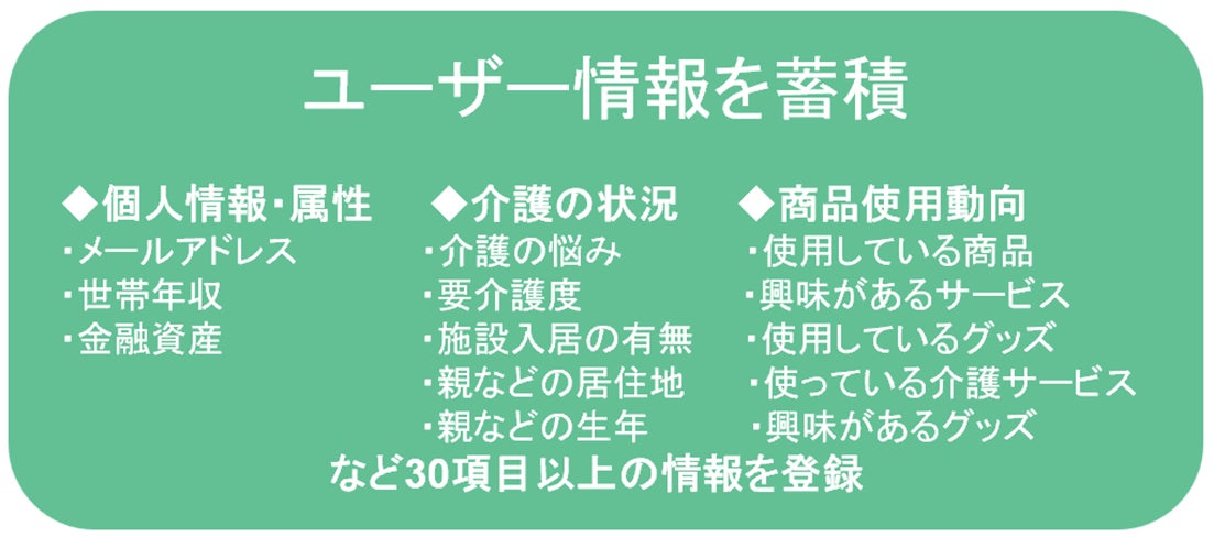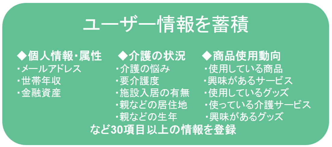 また、企業様に対しては、「介護のなかま」が持つユーザー情報を活用したユーザー動向分析やマーケティング、認知度向上、商品開発の役に立つサービスを目指しています。会員へのメールによる商品紹介、アンケート、サンプリングプレゼントも可能です。