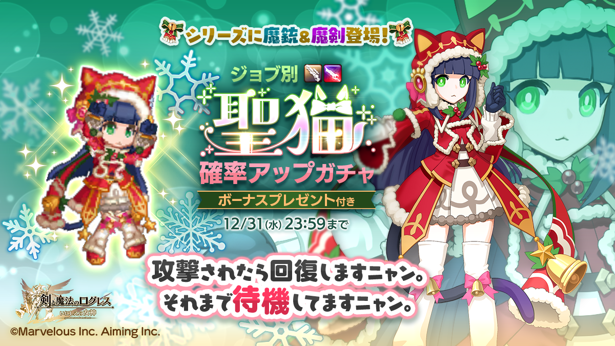 株式会社マーベラス(代表取締役社長:照井 慎一/所在地:東京都品川区)は、スマートフォン向け本格オンラインRPG『剣と魔法のログレス いにしえの女神』において、2025/12/17(水)に新武器がラインナップした「ジョブ別 聖猫確率アップガチャ」の販売、およびイベント「ログレス ワールドエキスポ」のエピローグ追加を含むアップデートを行ったことをお知らせいたします。