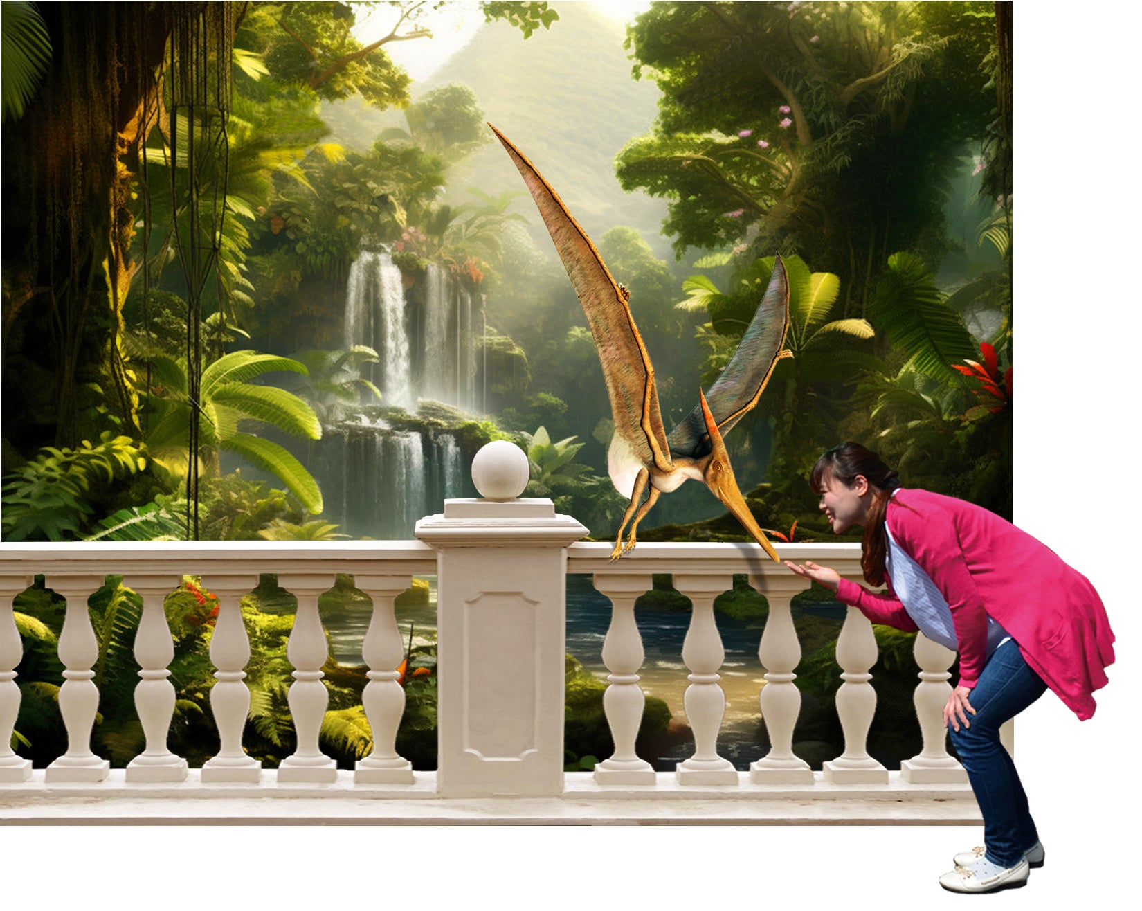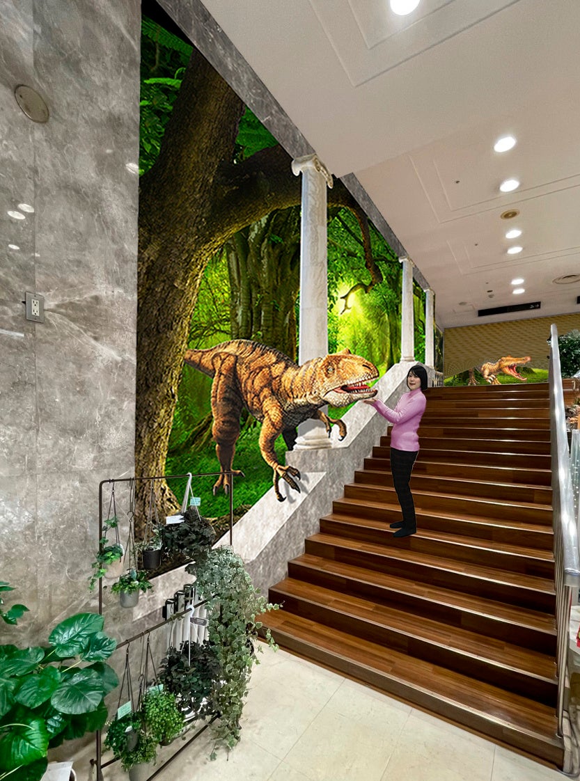 その第1弾として南館をハブとした体験型コンテンツとして今回のトリックアートを展開します。当初、苦労したのはトリックアートを“どんなモチーフにするのか?”ということでした。ヴォーリズ建築や大阪名所など、いろいろモチーフを検討しましたが、南館階段、壁面の大理石に「ウニのとげ」や「サンゴ」などの化石が隠れていることから「恐竜」も壁からでてきそうなデザインが面白いのではないかと考え、恐竜モチーフに決定しました。インバウンドのお客様はもちろん、日本の方々にもぜひ来館いただき、恐竜たちと一緒に写真を撮ってもらい<心斎橋エリア>を盛り上げていきたいです。