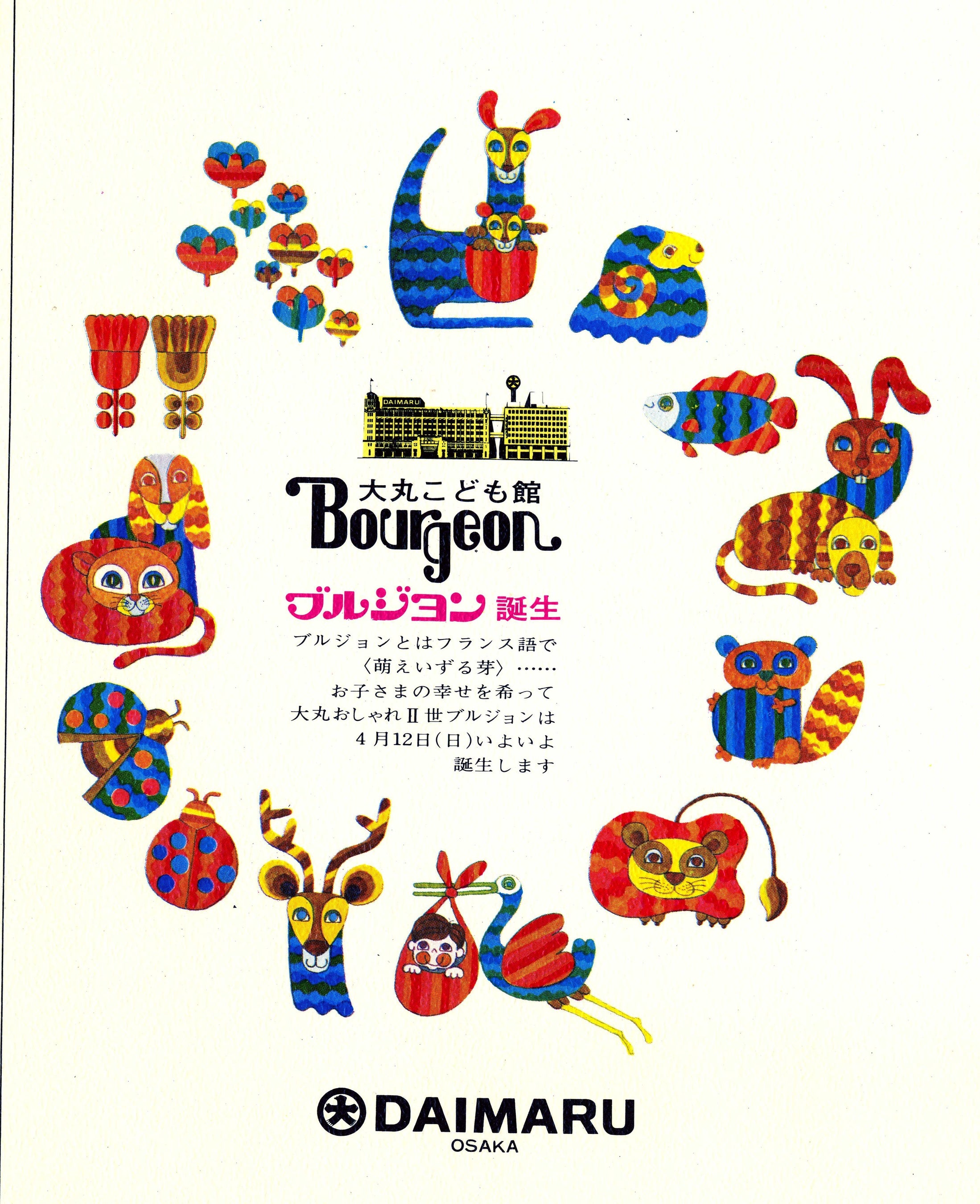 「大丸心斎橋店 こども館ブルジョン」として1970年(昭和45年)4月に誕生。地下2階、地上9階、全館がこども対象の売場という当時は日本初、世界的にも珍しい百貨店でした。児童心理学者との共同研究で各階の商品構成やフロアの色彩を決定。明るい照明や動物のパターンをあしらったビニール布張りの壁面など至るところに工夫を凝らしていました。