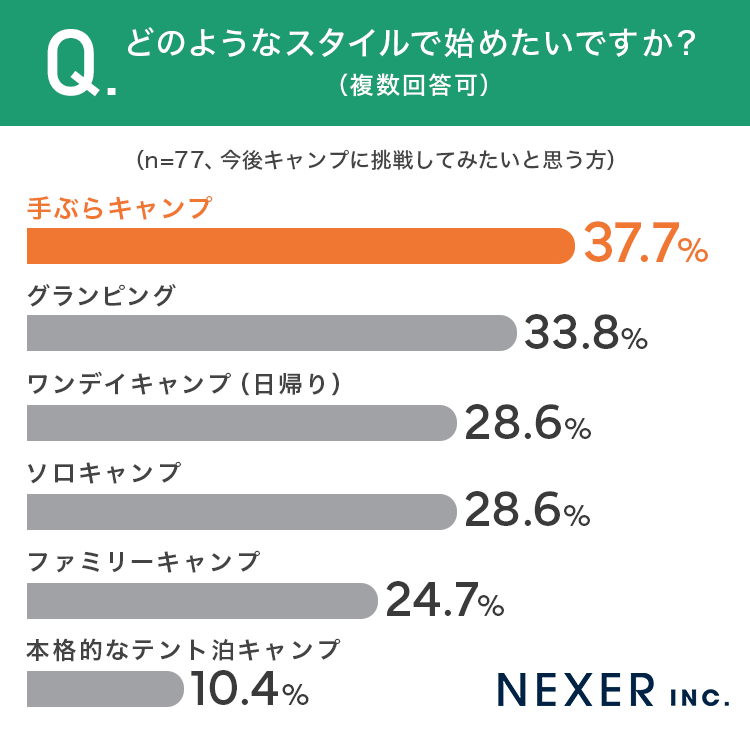 ただし、未経験者の約6割は「挑戦したい」と考えています。始め方としては、手ぶらキャンプやグランピングなど、準備の手間が少ないスタイルを選びたい人が目立ちました。