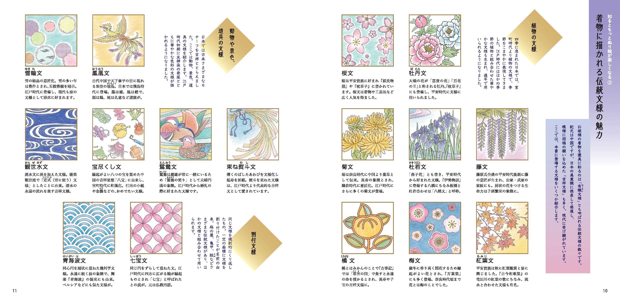 ページをめぐるたびに移り変わる季節ごとの衣装の文様、花々や草木、景色や風物、行事が楽しめ、