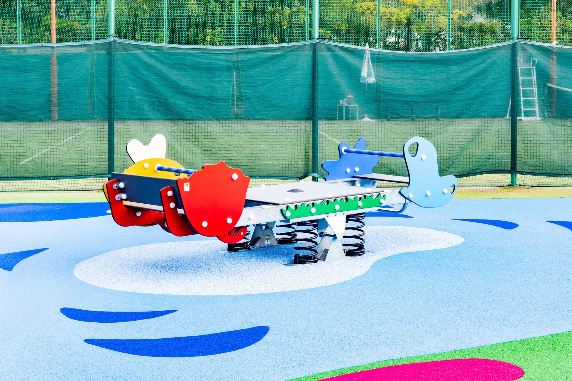 今回のリニューアルでは、屋外エリアに、大阪・関西万博「光の広場」で使用されていたデンマーク・コンパン社製の「グリーンライン」シリーズ2基を含む遊具3基を新たに導入。「グリーンライン」シリーズの遊具は、海洋廃棄物や使用済み繊維をリサイクルしたパネルや支柱を採用し、製造時の二酸化炭素排出量削減にも配慮したエコフレンドリーな設計が特徴です。