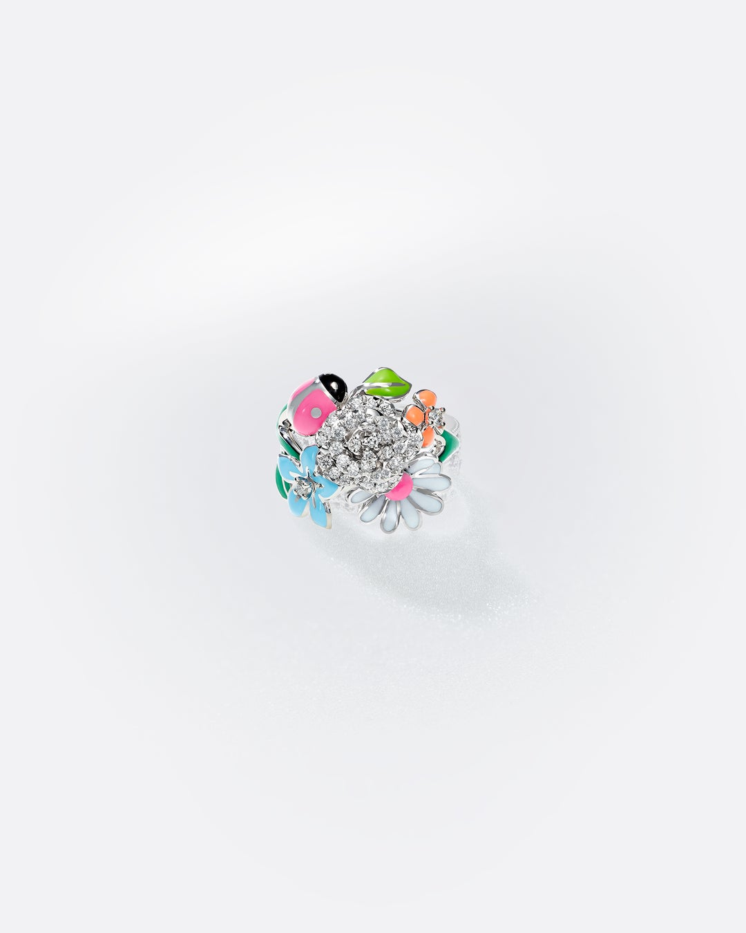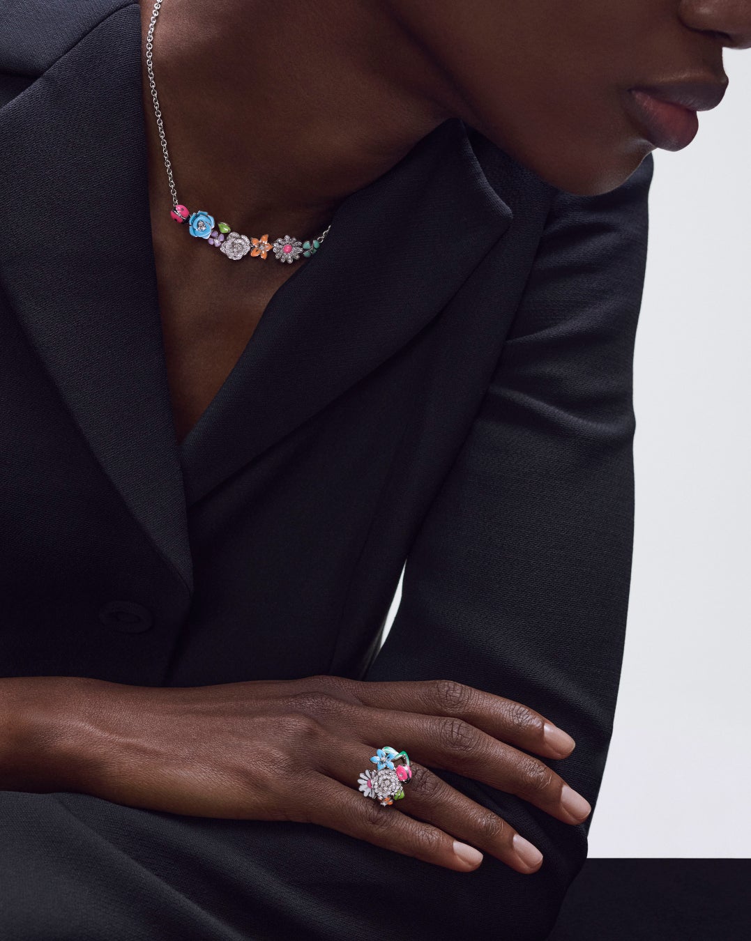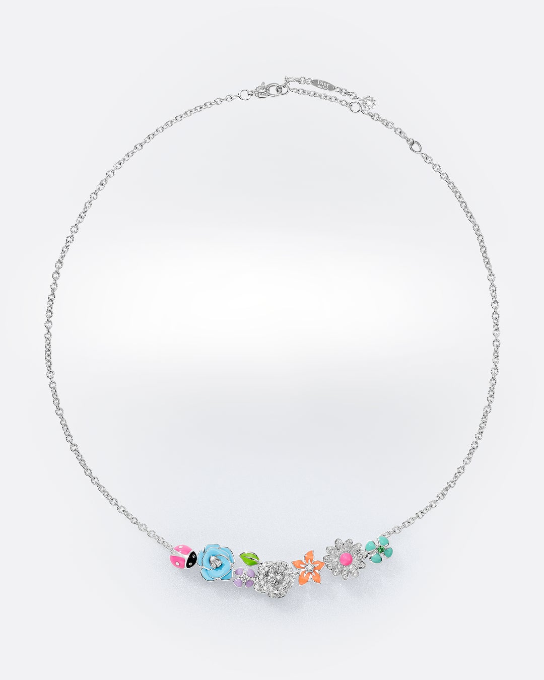 ヴィクトワール・ドゥ・カステラーヌのシグネチャーである鮮やかな彩りのラッカー細工にホワイトゴールド、ジェムストーンとダイヤモンドが組み合わされた新作ネックレス、イヤリング、リングは 華やかな色彩美が際立ちます。