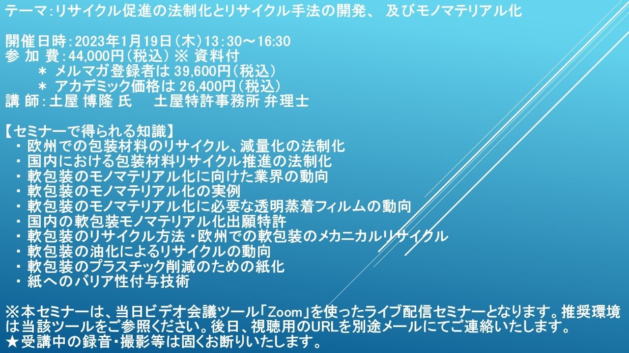 先端技術情報や市場情報を提供している(株)シーエムシー・リサーチ(千代田区神田錦町: https://cmcre.com/ )では、 各種材料・化学品などの市場動向・技術動向のセミナーや書籍発行を行っておりますが、 このたび「リサイクル促進の法制化とリサイクル手法の開発、及びモノマテリアル化」と題するセミナーを、 講師に土屋 博隆 氏 土屋特許事務所 弁理士)をお迎えし、2023年1月19日(木)13:30より、 ZOOMを利用したライブ配信で開催いたします。 受講料は、 一般:44,000円(税込)、 弊社メルマガ会員:39,600円(税込)、 アカデミック価格は26,400円(税込)となっております(資料付)。