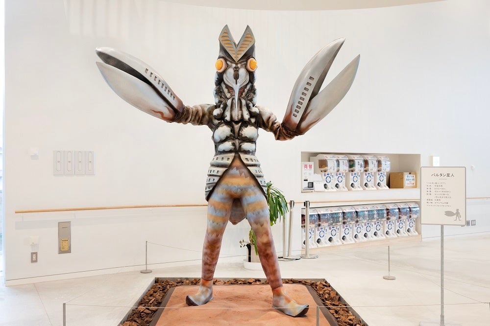 須賀川市民交流センター「tette」(福島県須賀川市)1階に展示されるバルタン星人。この施設の5階に円谷英二ミュージアムが入る。