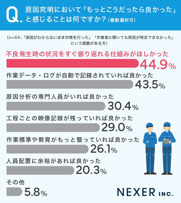 複数選択では「不良発生時の状況をすぐ振り返れる仕組みがほしかった」が44.9%で最多でした。次いで「作業データ・ログが自動で記録されていれば良かった」が43.5%、「原因分析の専門人員がいれば良かった」が30.4%と続きます。