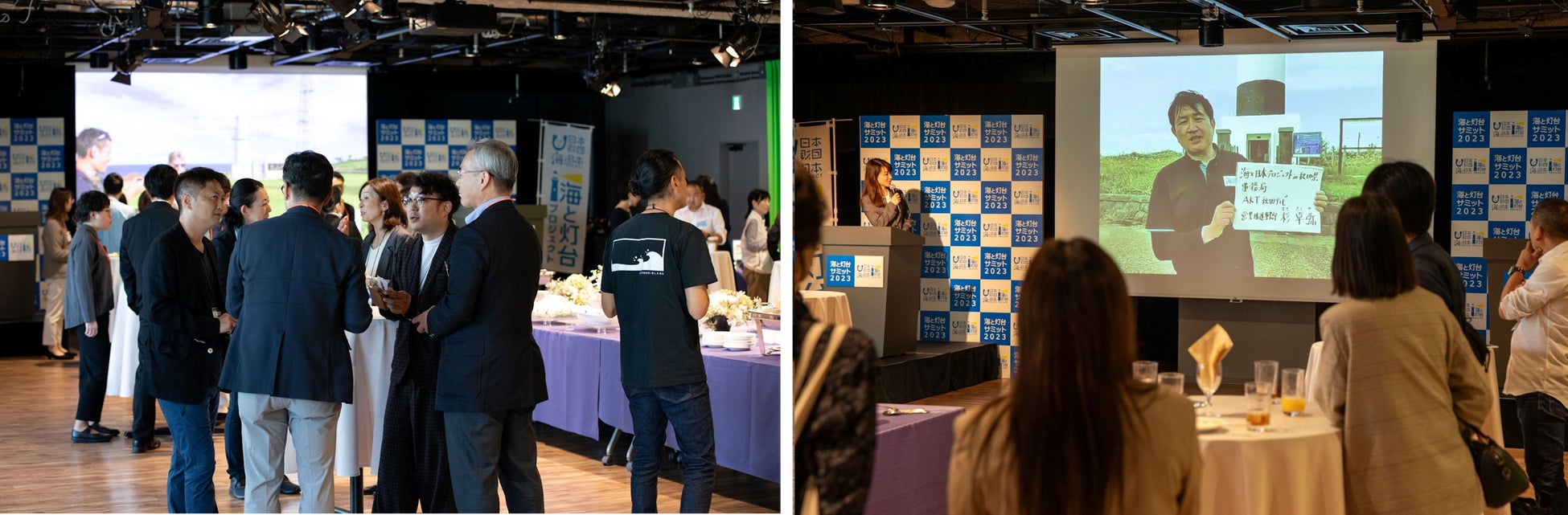 シンポジウム終了後、登壇者と、全国各地から集まった「海と灯台のまち」自治体担当者や灯台利活用に取り組む団体の担当者、灯台に興味関心を持つ企業担当者などによる情報交換会を実施。「海と灯台ウィーク」関連イベントを実施していた佐田岬灯台(愛媛県)、入道埼灯台(秋田県)、野間埼灯台(愛知県)の各会場との生中継も行いました。シンポジウムやイベント生中継に刺激を受けた参加者は、灯台利活用に関する意見交換や、お互いのまちでの取り組み・課題に関する情報交換などを活発に行いました。