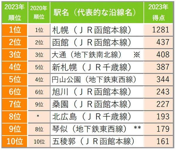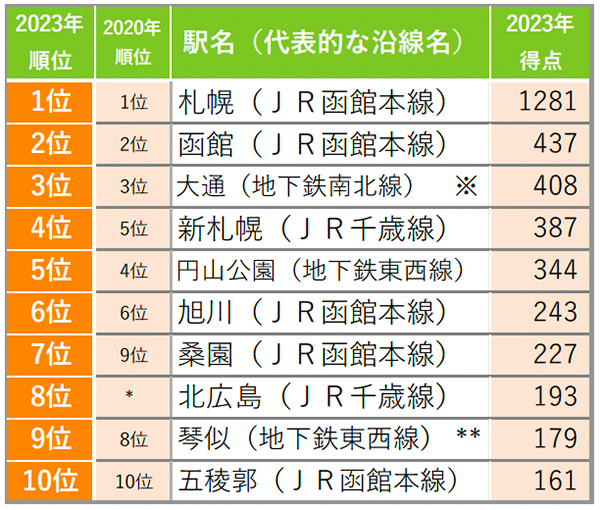 北海道(駅)ランキングでは「桑園」が9位→7位に、「北広島」が圏外から8位にランクイン