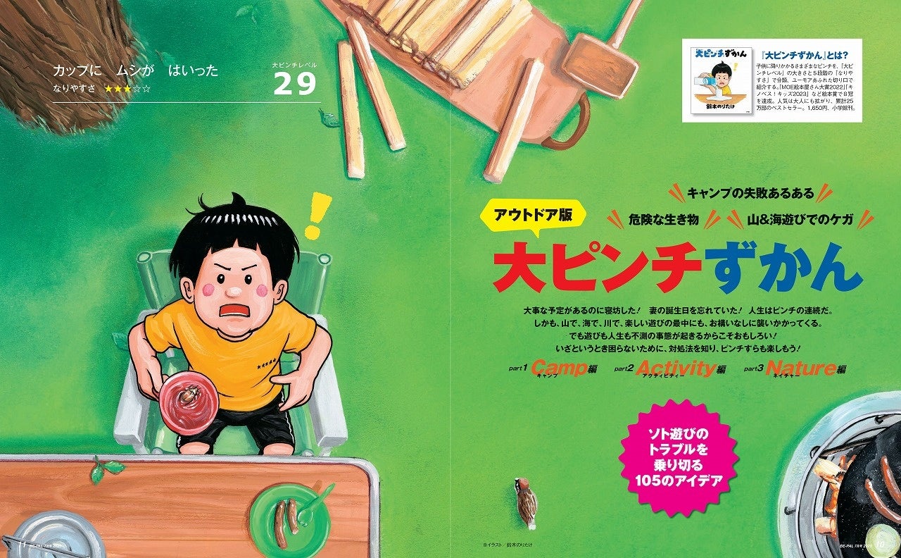 さらに、今号の大特集は「アウトドア版 大ピンチずかん」。キャンプやソト遊び中に、ちょっとしたトラブルは付き物。ペグを忘れた、トゲが刺さった、薪が濡れて火がつかない。キャンプの失敗あるあるから、危険な生き物、山&海遊びのケガまで、105のアイデアでピンチを乗り切ろう!