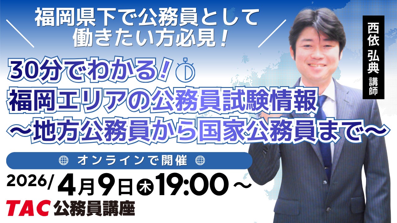 資格取得に向けた教育サービスを展開しているTAC株式会社(東京都千代田区)では、公務員試験を検討されている方へ向けて「福岡エリアの公務員試験情報~地方公務員から国家公務員まで~」を、オンラインで開催します。