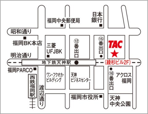 TAC福岡校は、福岡市の中心部、天神にあります。交通網も充実し、とても通い易い環境にあります。実際にさまざまな大学の学生、既卒者、社会人が通っているので、大学とはまた違う、刺激にあふれた環境で学習することができます。公務員試験には、多くの学習時間が必要な択一試験だけでなく、論文試験、面接試験も課されます。一人では対策が難しくても、TAC福岡校に来てくだされば安心です。全ての講師、スタッフ一同、全力でサポートします。TAC福岡校のチームワークはどこにも負けません。一緒に合格を勝ち取りましょう!