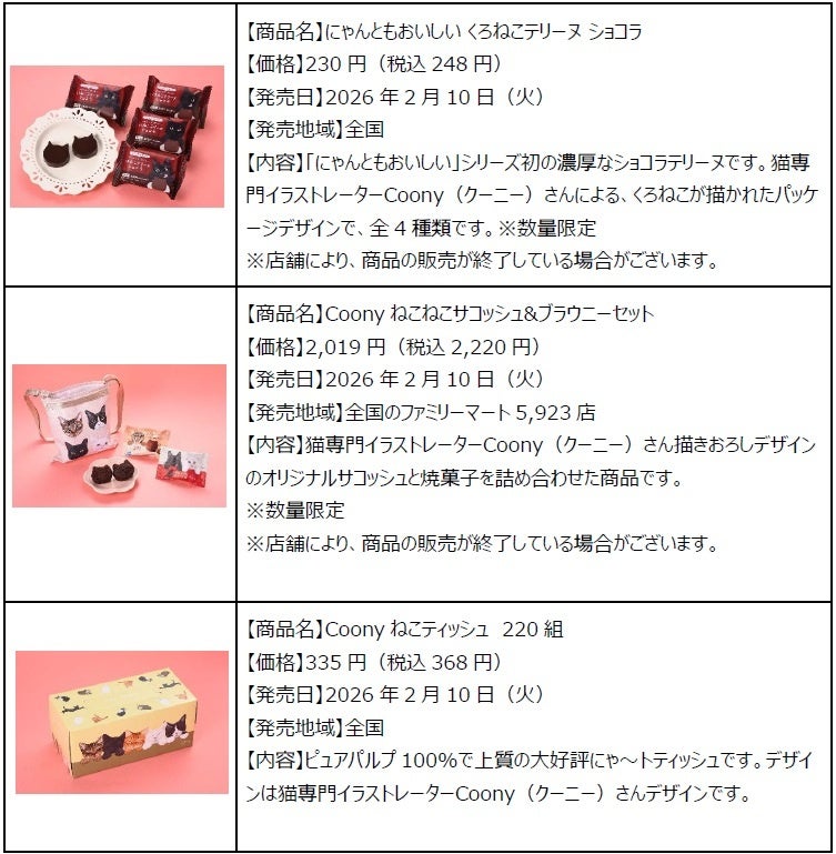 株式会社ファミリーマート(本社:東京都港区、代表取締役社長:細見研介)は、継続して取り組んでいる5つのキーワードの1つである「『あなた』のうれしい」の一環として、2月22日の“ねこの日”に合わせて、ねこモチーフのデザート・パン・お菓子や日用品などのオリジナル商品17種類を発売する「ファミリ~にゃ~ト大作戦!」を、2026年2月10日(火)から全国のファミリーマート16,400店にて開催しております。