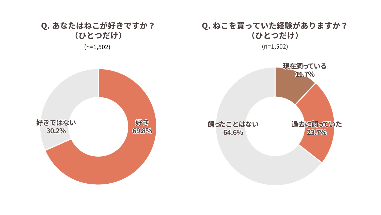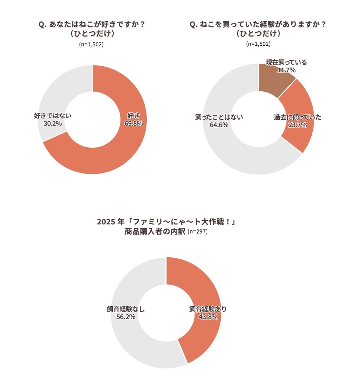 ファミペイ会員1,502人を対象に実施した調査では、「ねこが好き」と回答した人は約7割(69.8%)にのぼりました。一方で、現在ねこを飼っている人は約1割(11.7%)にとどまり、過去に飼育経験がある人を含めても3割強という結果となりました。
