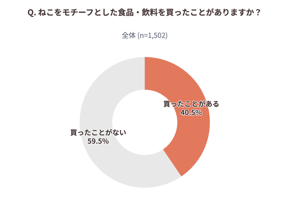 ねこをモチーフにした食品・飲料の購入経験について尋ねたところ、全体の40.5%が「購入したことがある」と回答しました。