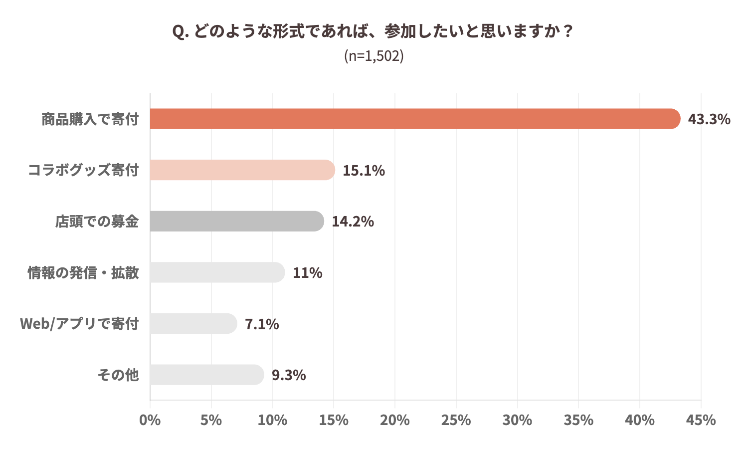 また、参加しやすい支援形式としては「商品購入で寄付につながる」(43.3%)が最も多く、消費行動そのものが社会貢献につながる仕組みへのニーズの高さが示されました。