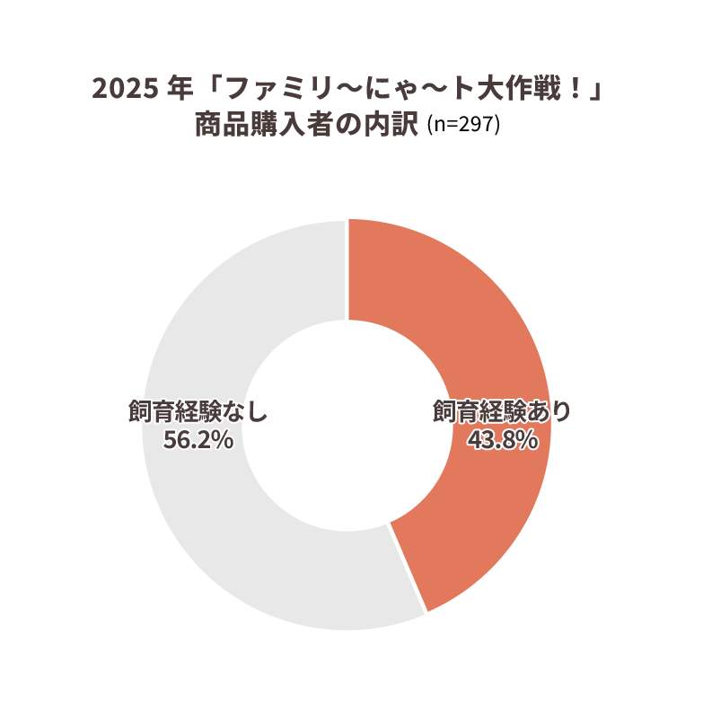 また、2025年にファミリーマートで実施した「ファミリ~にゃ~ト大作戦!」の展開商品を購入した実績のある人に絞ると、購入者のうち56.2%がねこを飼ったことがない層で、飼育経験者(43.8%)を上回りました。特に「飼育経験はないがねこが好き」という層は全体の37.7%を占めており、事情により飼えない人を含む“ねこ関心層”が、ねこの日商戦を支える重要な存在であることがうかがえます。