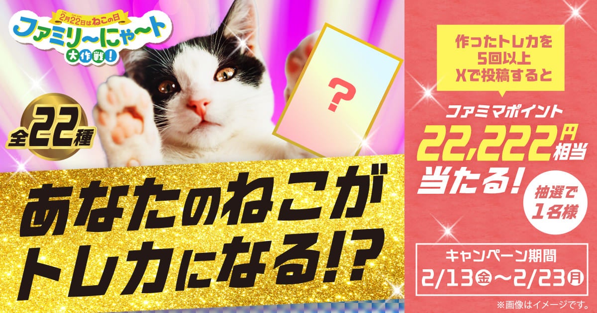 特設サイトで作成した愛猫トレカの画像を、ファミリーマートの公式Xアカウント(@famima_now)をフォローし、指定のハッシュタグ『#ファミリ〜にゃ〜ト大作戦』をつけて5回以上投稿すると、抽選で1名さまに22,222円相当のファミマポイントが当たるキャンペーンを実施しております。