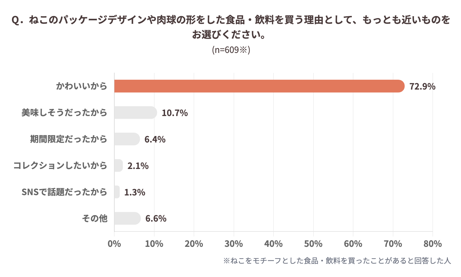 購入理由として最も多かったのは「かわいいから」で、72.9%と突出した結果に。「美味しそうだったから」(10.7%)や「SNSで話題だったから」(1.3%)を大きく上回っており、ねこモチーフ商品は味や機能性よりも、視覚的なかわいさや感情的なときめきが購買のきっかけとなる、衝動性の高い商品カテゴリーであることが示されています。