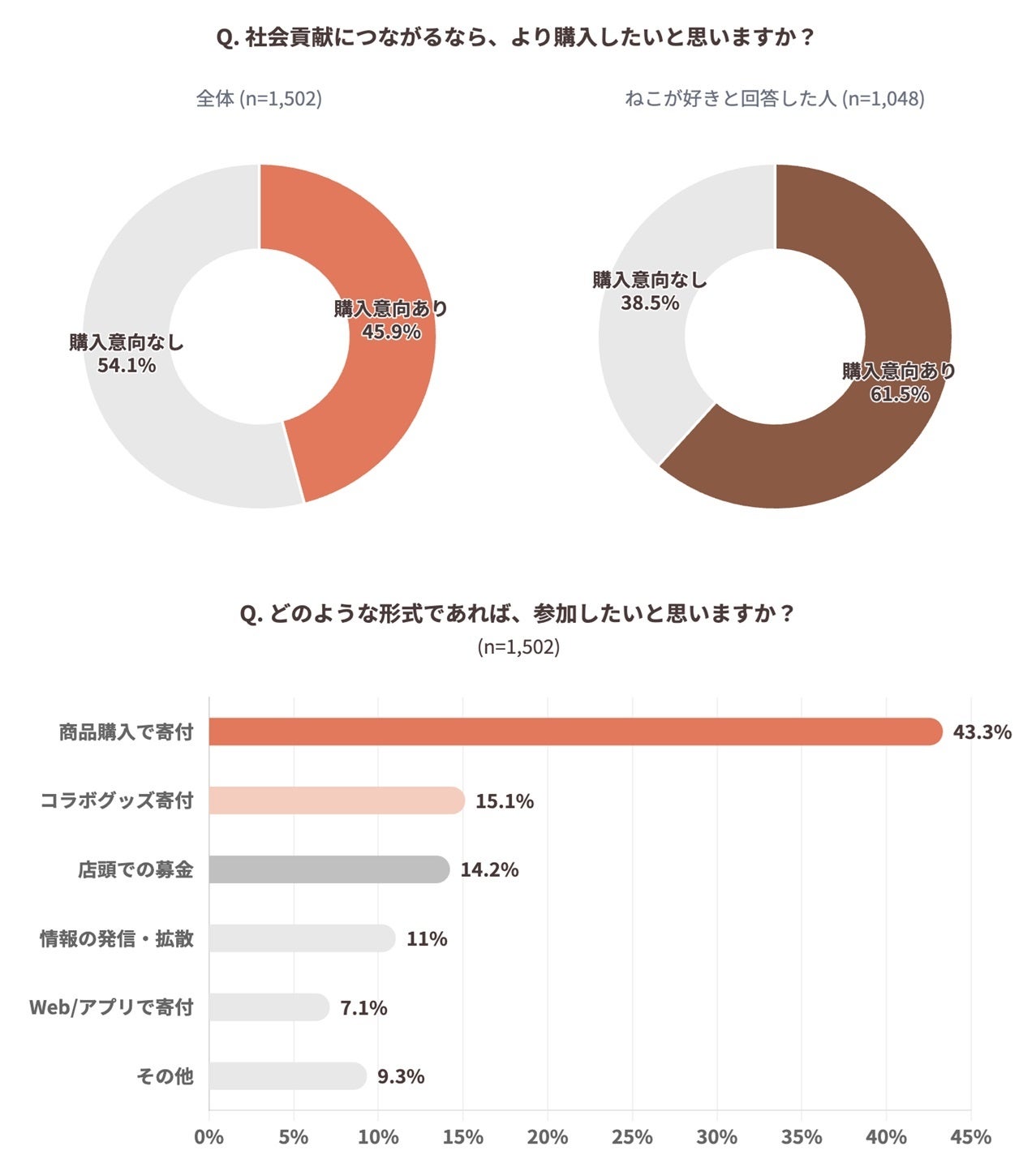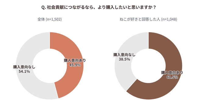 「ねこの日の商品が、保護猫支援などの社会貢献につながるとしたら、より購入したいと思うか」という問いに対し、全体の45.9%が肯定的に回答しました。ねこ好き層に限ると、その割合は61.5%に達しています。