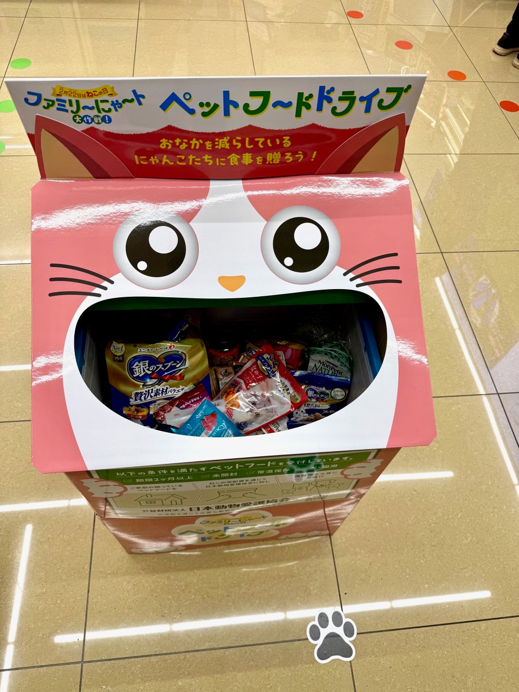 ファミリーマートは、ねこの日をいつも癒してもらっているねこへ恩返しする日と考え、地域猫活動への支援を強化しています。近年、“ペットフードロス”が問題となる中、店名に“猫”がある、ねこにまつわる一部店舗を中心に「ペットフードドライブ」を設置しています。実施店舗では、“ねこの足跡”が店舗からペットフードドライブまでご案内します。