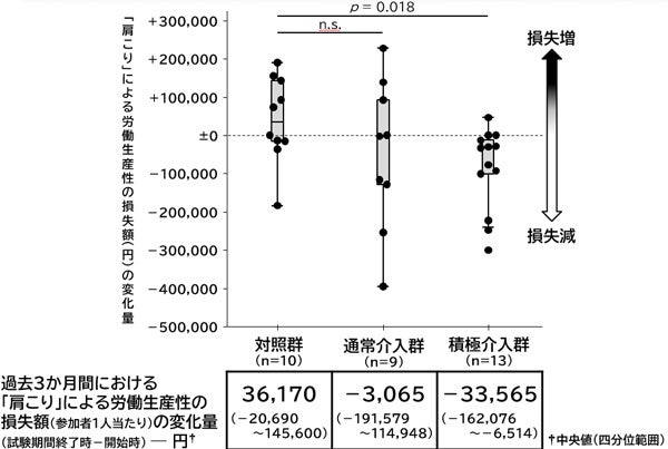 ※2.主要評価項目は肩こりによる労働生産性の損失額の変化量(試験期間中-前)とし、労働生産性の損失額は、3ヵ月間における肩こりによる労働生産性の低下割合(1-仕事の量×仕事の質/100)を算出し、これに同産業・同企業規模における平均的な給与と賞与の合計額を365日で除した値と過去3ヵ月間に肩こりを自覚した日数との積で求めた。