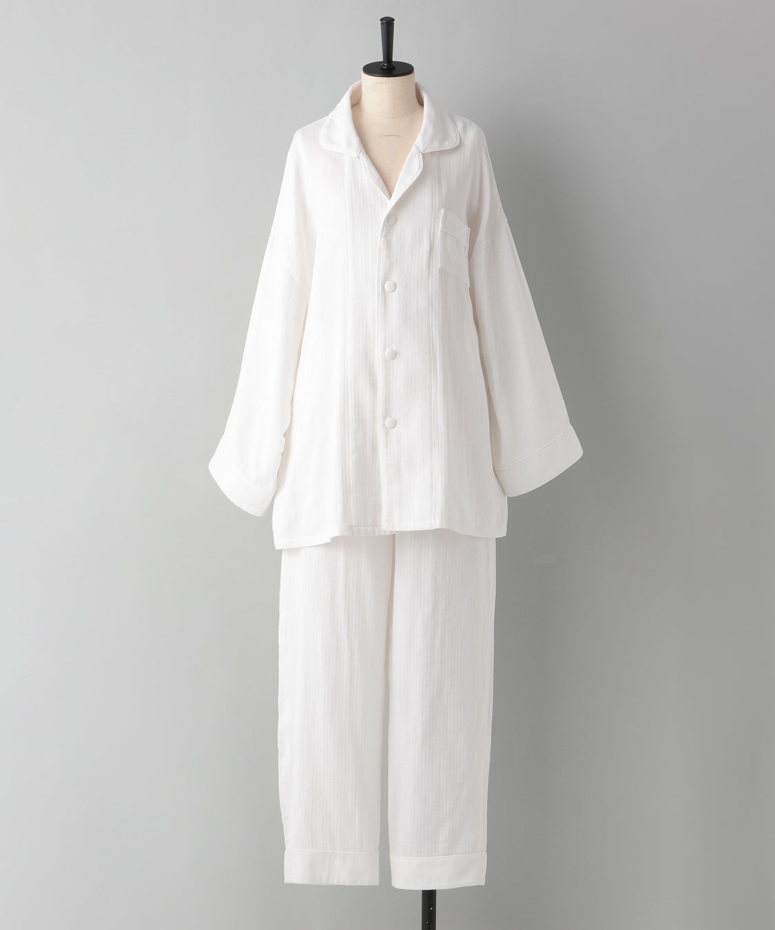 ダブルガーゼ素材で仕立てたシャツとパンツのセットアップ。